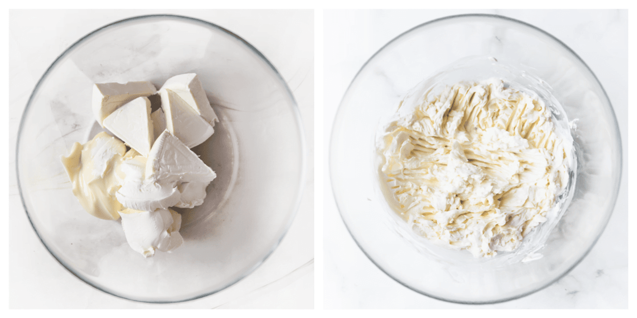 Doe de roomkaas samen met la vache qui rit in een diepe kom. Stamp/prak het fijn en zet apart.