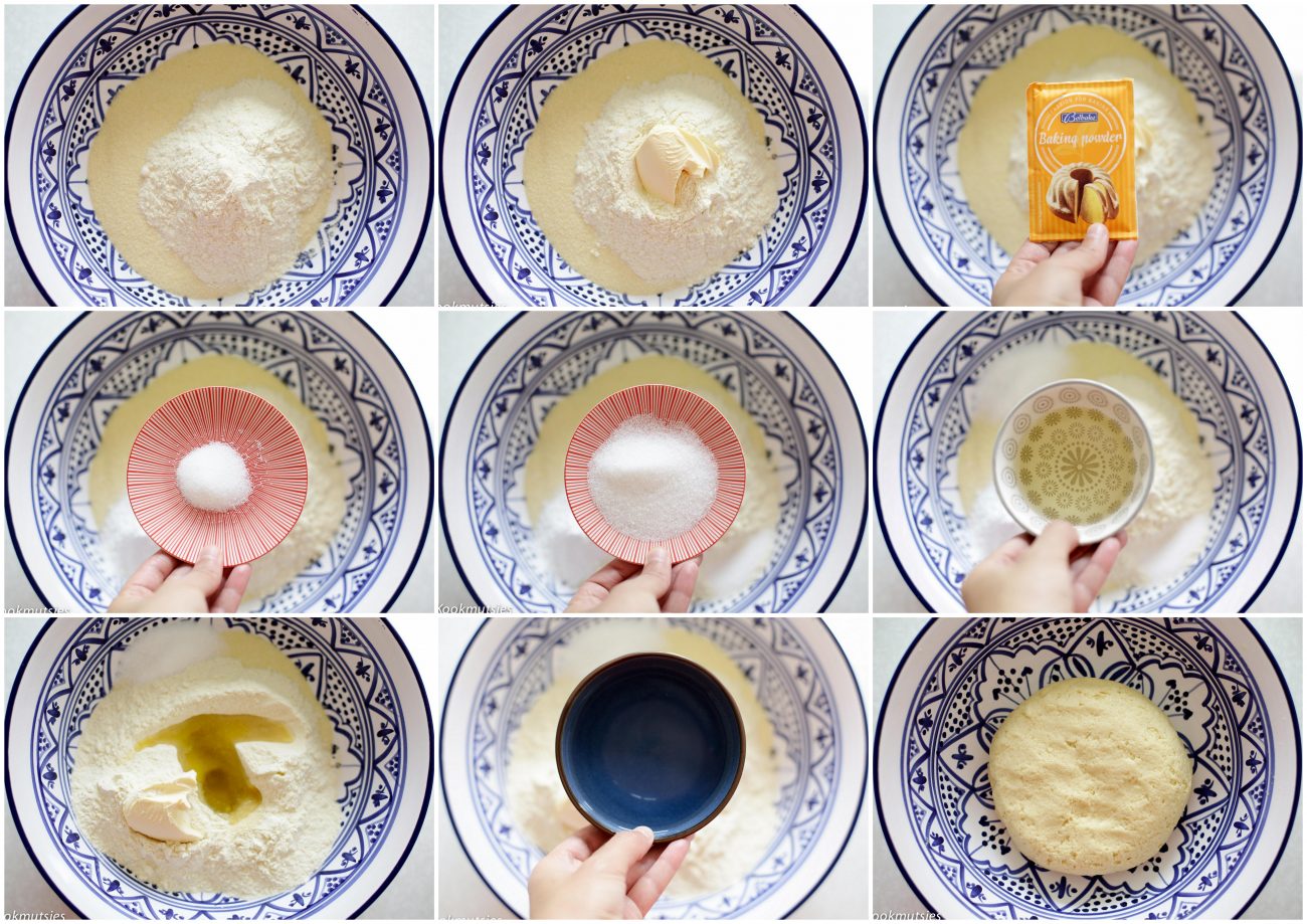 Doe de griesmeel in een diepe kom en voeg de bakpoeder, zout, suiker, olijfolie, boter en water toe en kneed dit samen voor 3 minuten. Laat het 5 minuten staan( dit doe je zodat de griesmeel het water opneemt en makkelijker wordt om te kneden. Na 5 minuten kan je het weer verder kneden voor 3 minuten.