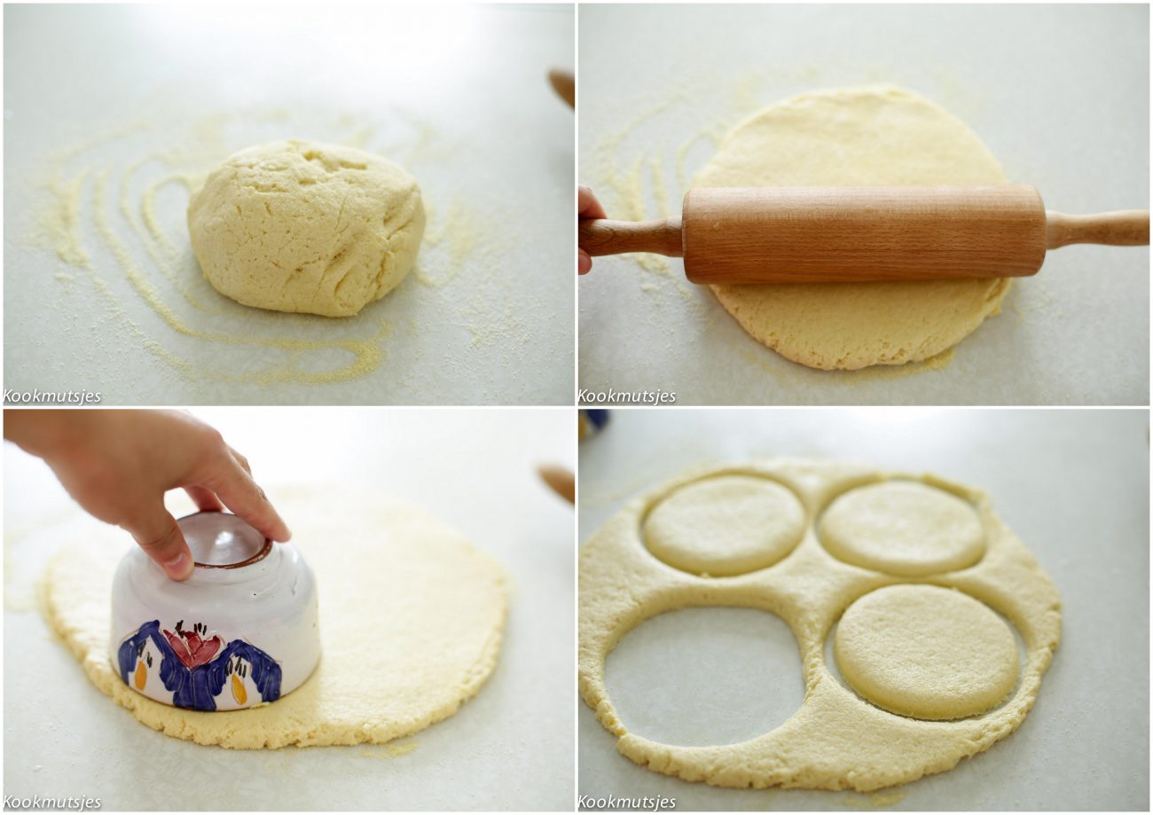 Strooi wat griesmeel op de werkplek. Rol het deeg uit en haal er rondjes uit (ik heb een soepkom gebruikt).
