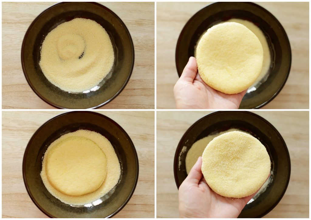 Doe wat griesmeel in een kom. Dep de harcha erin. Op deze manier creëer je een ruwe textuur aan beide kanten.