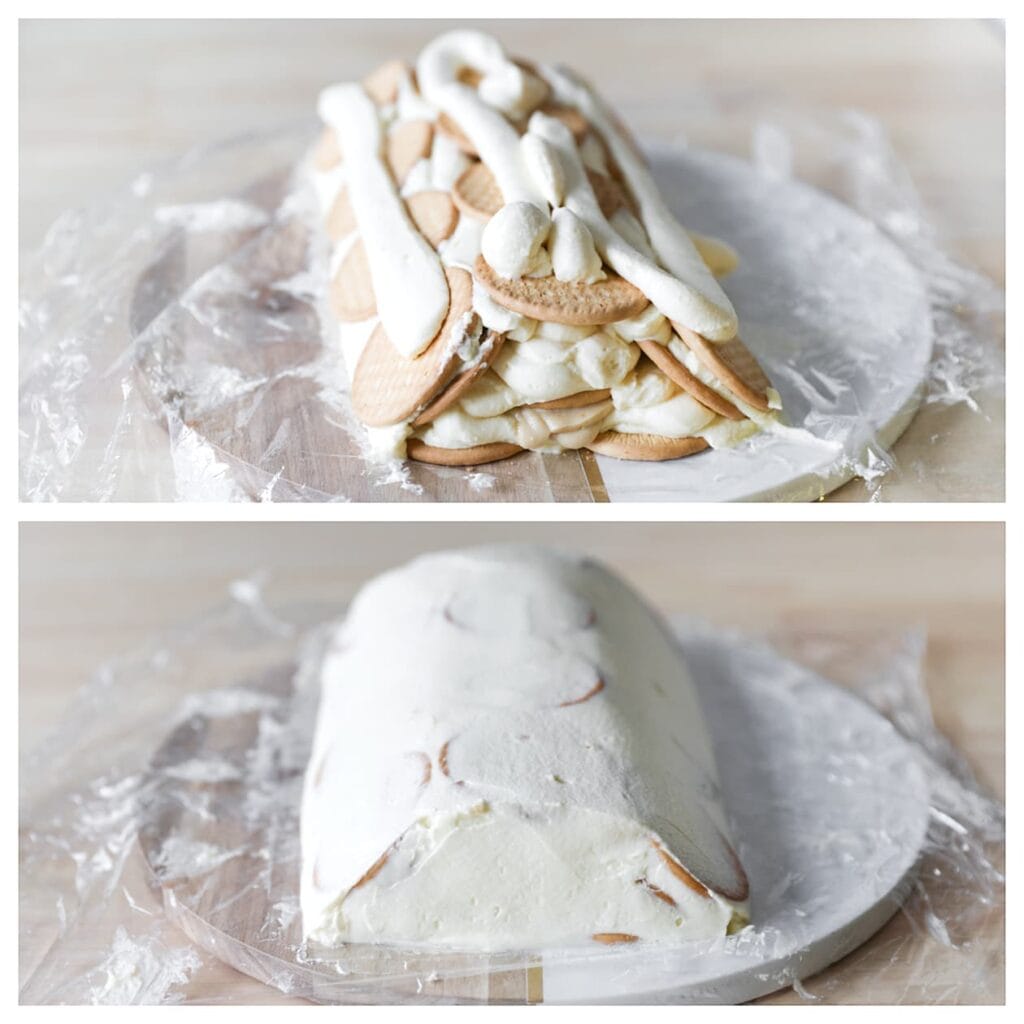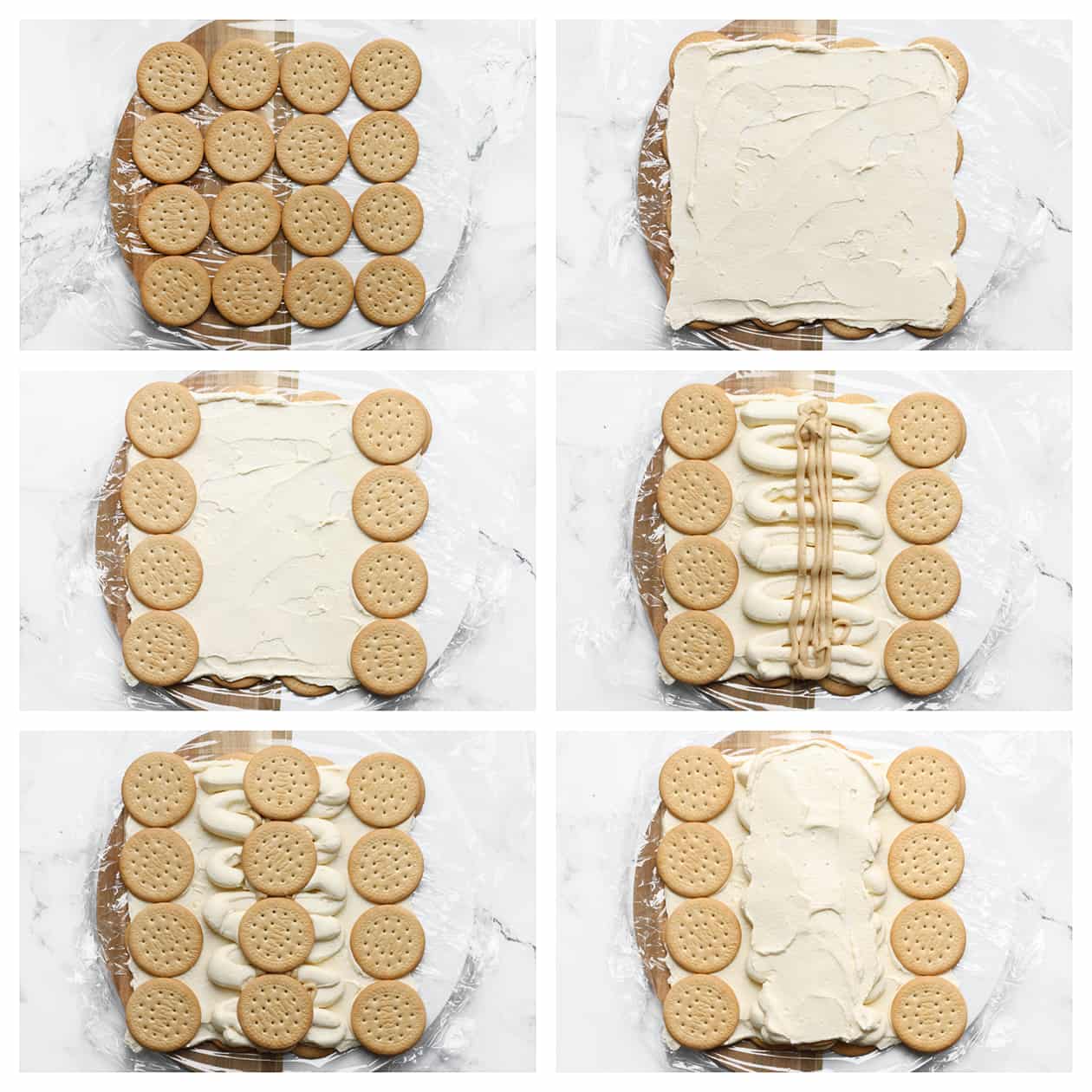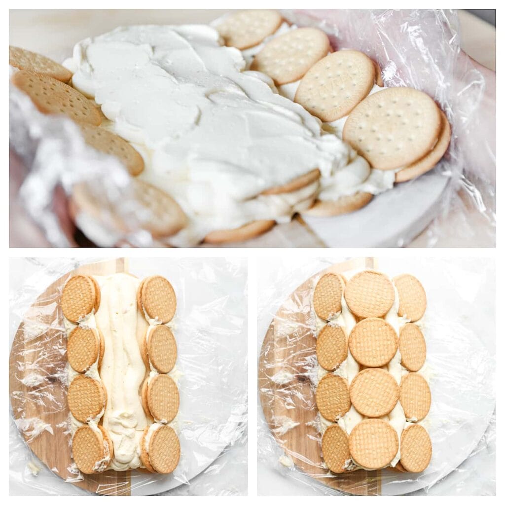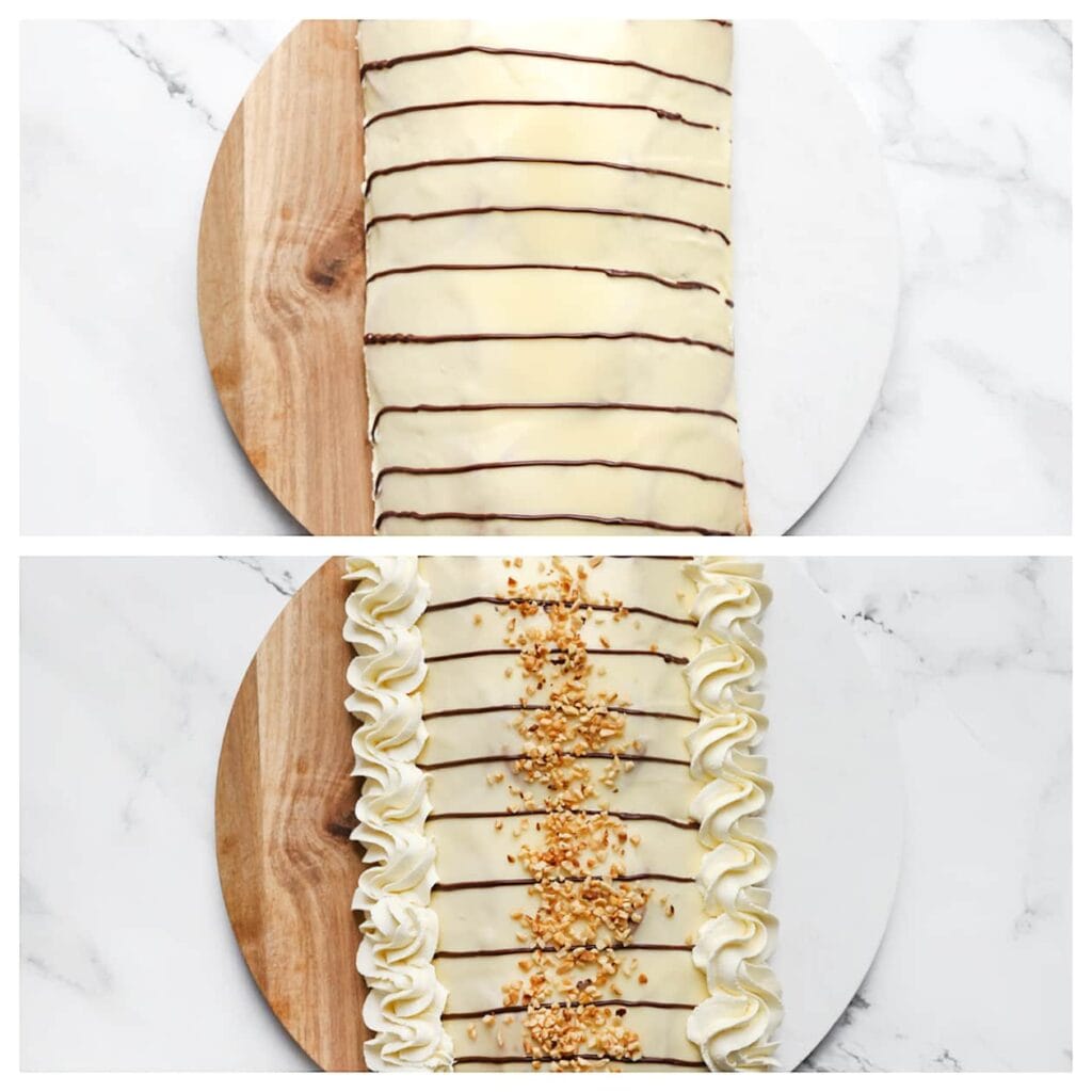 Neem een vel huishoudfolie en bedek hiermee een schaal of onderlegger. Leg de mariabiscuits in 4 rijen van 4 op de huishoudfolie. Verdeel een deel van het roommengsel gelijkmatig over de koekjes. Plaats vervolgens nog een rij mariabiscuits aan de rechter- en linkerzijde. Spuit in het midden wat room met hierop wat hazelnootpasta. Bedek de hazelnootpasta met een rij koekjes. Spuit hier wat extra room overheen en verdeel deze gelijkmatig. |