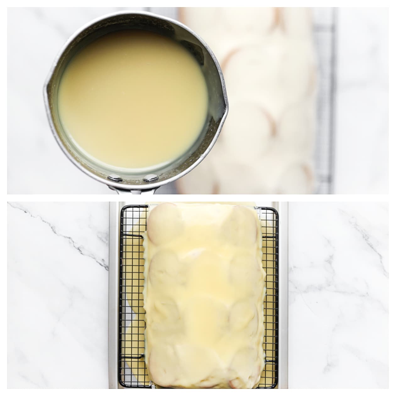 Zorg ervoor dat de witte chocoladeganache niet te warm is wanneer je het over het dessert giet. Anders kan het dessert smelten. Laat de ganache dus een beetje afkoelen voordat je het gebruikt.