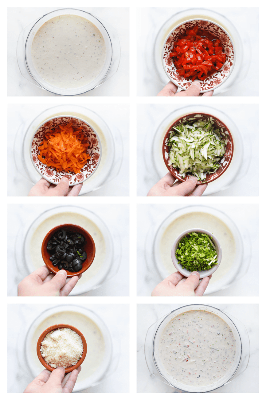 Add the bell pepper, zucchini, chives, carrot, black olives, and Grana Padano to the batter. Mix until combined.