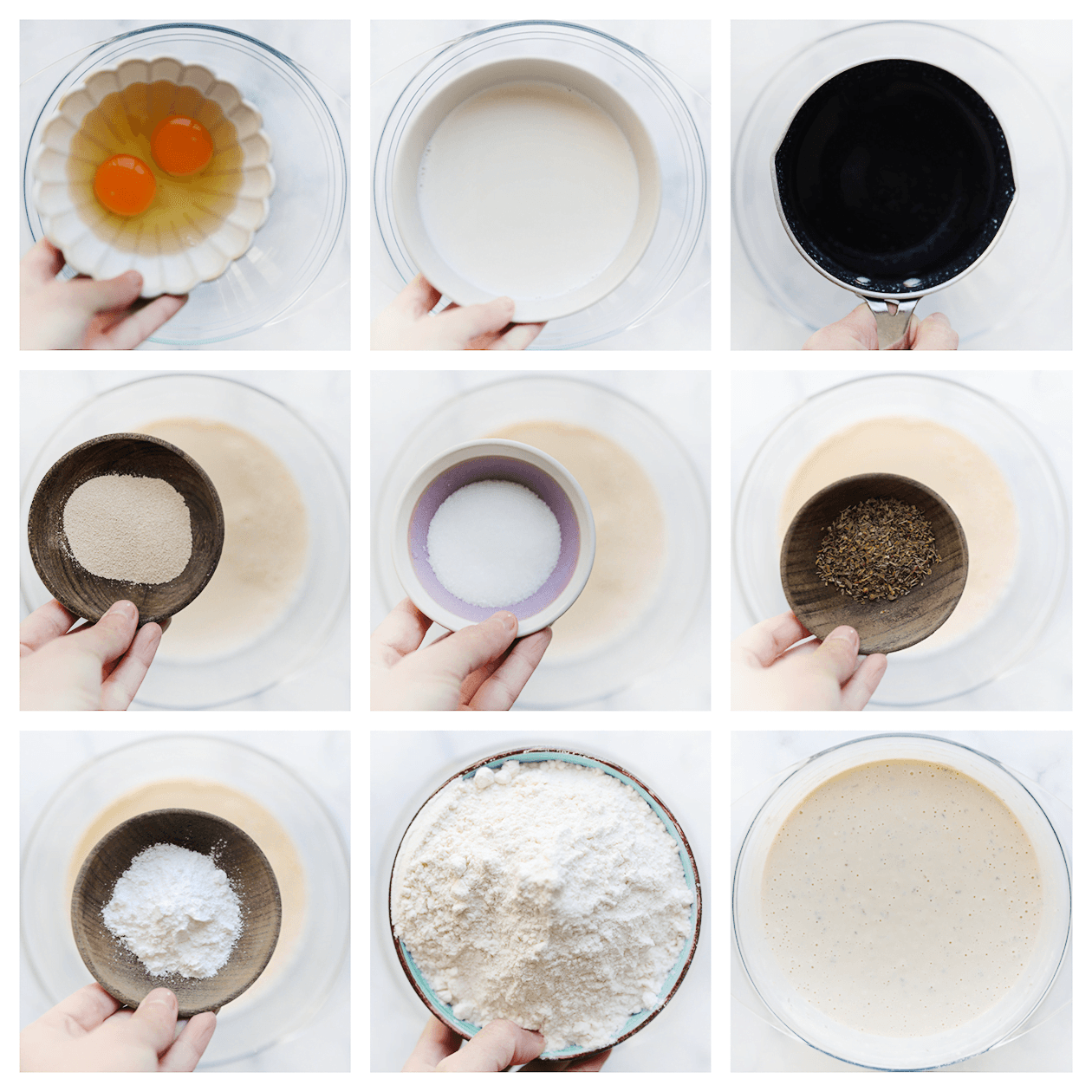 Break the eggs into a bowl and whisk. Add the warm milk and mix well. Add the yeast, sugar, baking powder, and Italian seasoning, then mix until combined. Gradually add the warm water and stir well. Add the flour and salt, mix until smooth. Cover and let the batter rise for 15-30 minutes.
