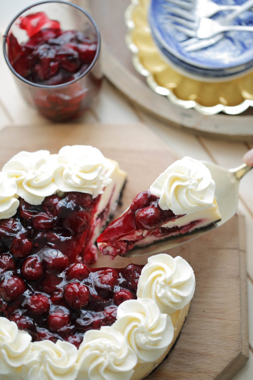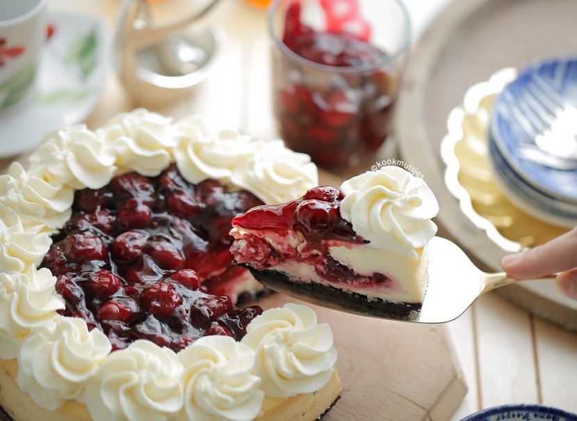 Deze kersen cheesecake heeft lagen van kersen, romige vulling en een stevige koekjesbodem van Oreo. Alles wordt langzaam gebakken tot perfectie en dat proef je! Bekijk snel de stappen van dit eenvoudig recept en maak het vandaag nog!