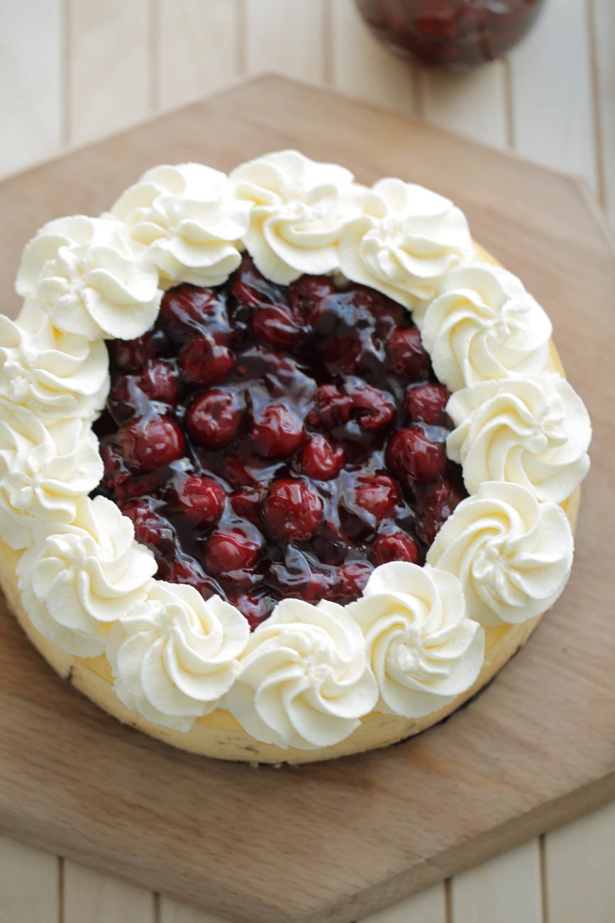 Je zult dol zijn op deze romige kersen cheesecake! Niet alleen omdat het zo heerlijk is, maar omdat het ontzettend simpel te maken is! Deze smaakvolle dessert maakt een heerlijke afsluiting van de dag, het is makkelijk vooruit te maken en ideaal voor elke speciale gelegenheid!