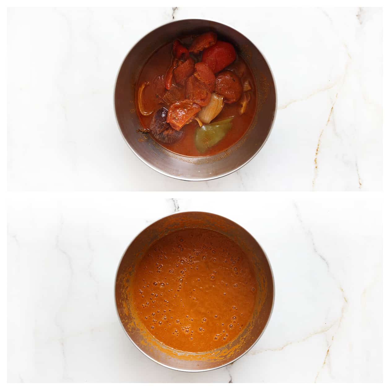 Pel de rode en gele ui en snijd ze grof. Ontvel de tomaten en snijd ze in parten. Snijd ook de rode en groene paprika in grove stukken. |