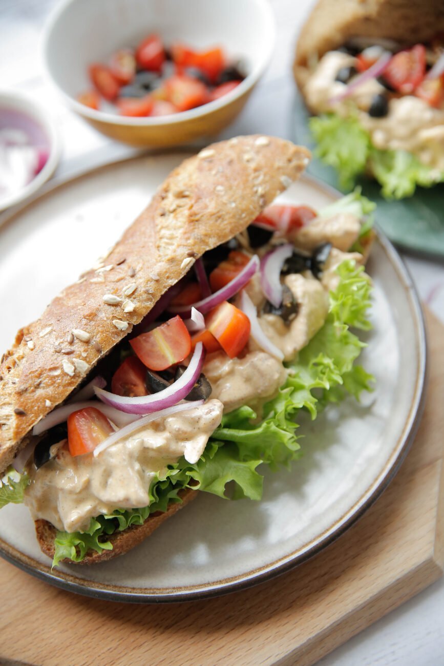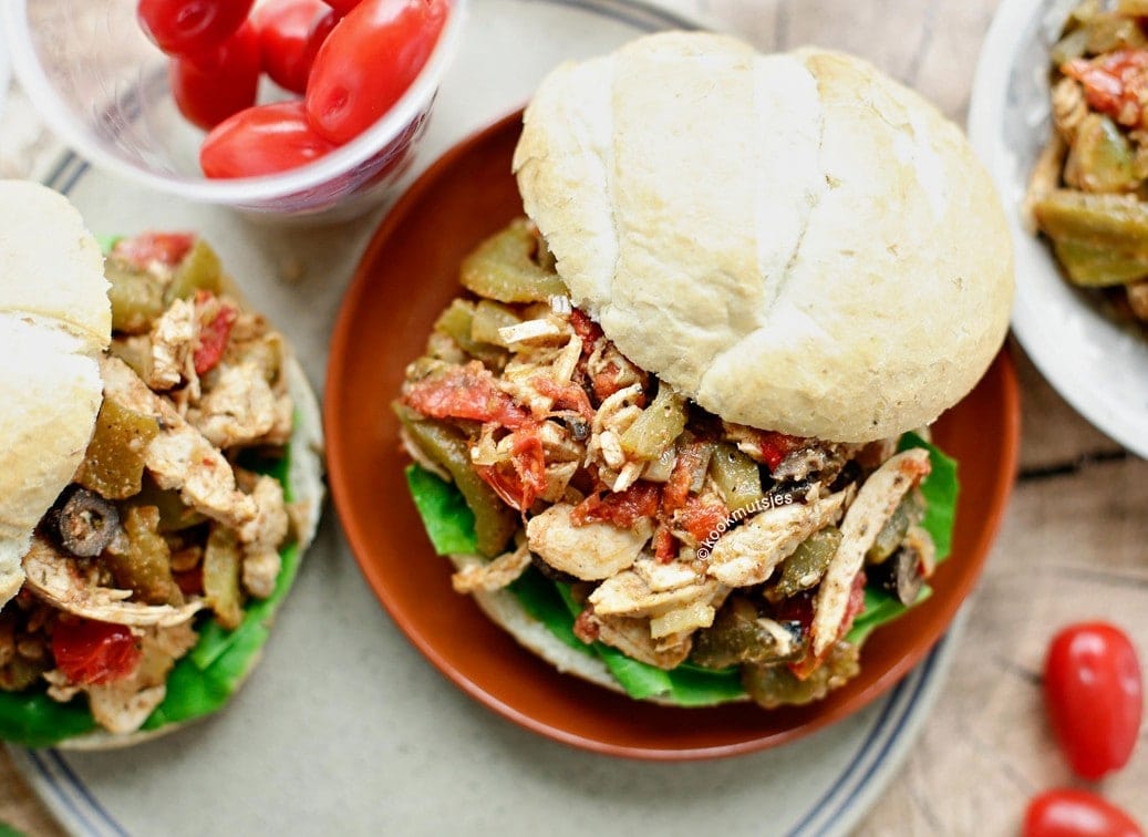 – Serveer de kip in knoflooksaus met tomaat, ui, zwarte olijven en sla.