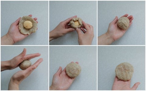Kleine tip. Vond het gehakt wat plakkerig dus heb het bolletje plat gemaakt tussen vershoudfolie, was ook meteen makkelijk om daarna het gehakt om de kaas te krijgen.