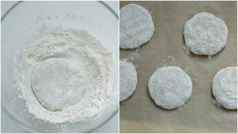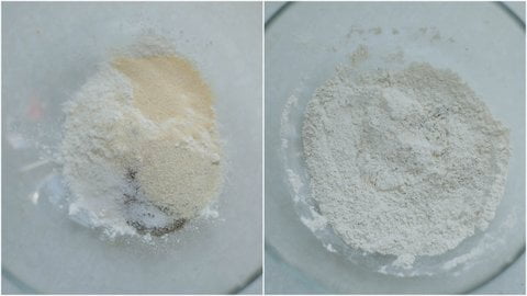 Voeg de bloem, zwarte peper, uienpoeder, knoflookpoeder en zout in een diepe kom. Meng samen en leg apart.