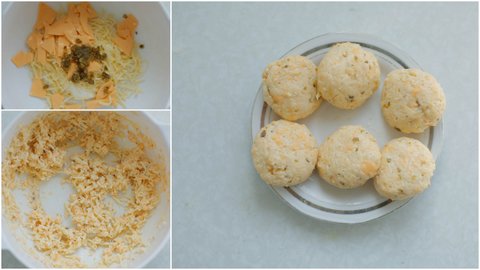 Doe de geraspte kaas, smeerkaas, cheddar kaas en fijngehakte jalapenos in een diepe kom. Mix samen tot een geheel. Verdeel de kaas in 5 stukken (30 gr per bol).