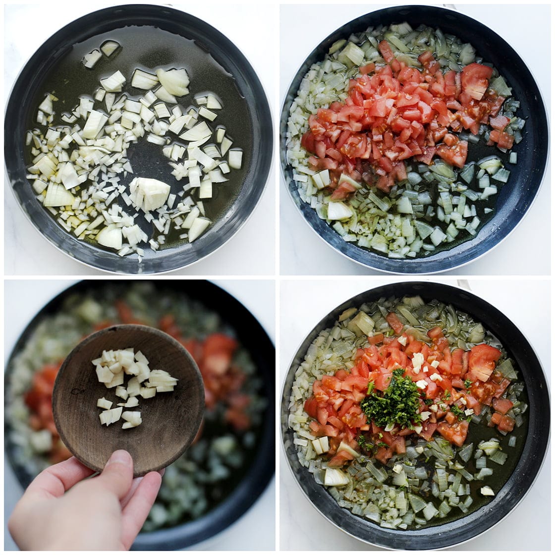 Pel de gele ui en knoflook. Ontvel de tomaat. Snipper de gele ui en hak de knoflook in kleine stukken. Hak de peterselie fijn. |