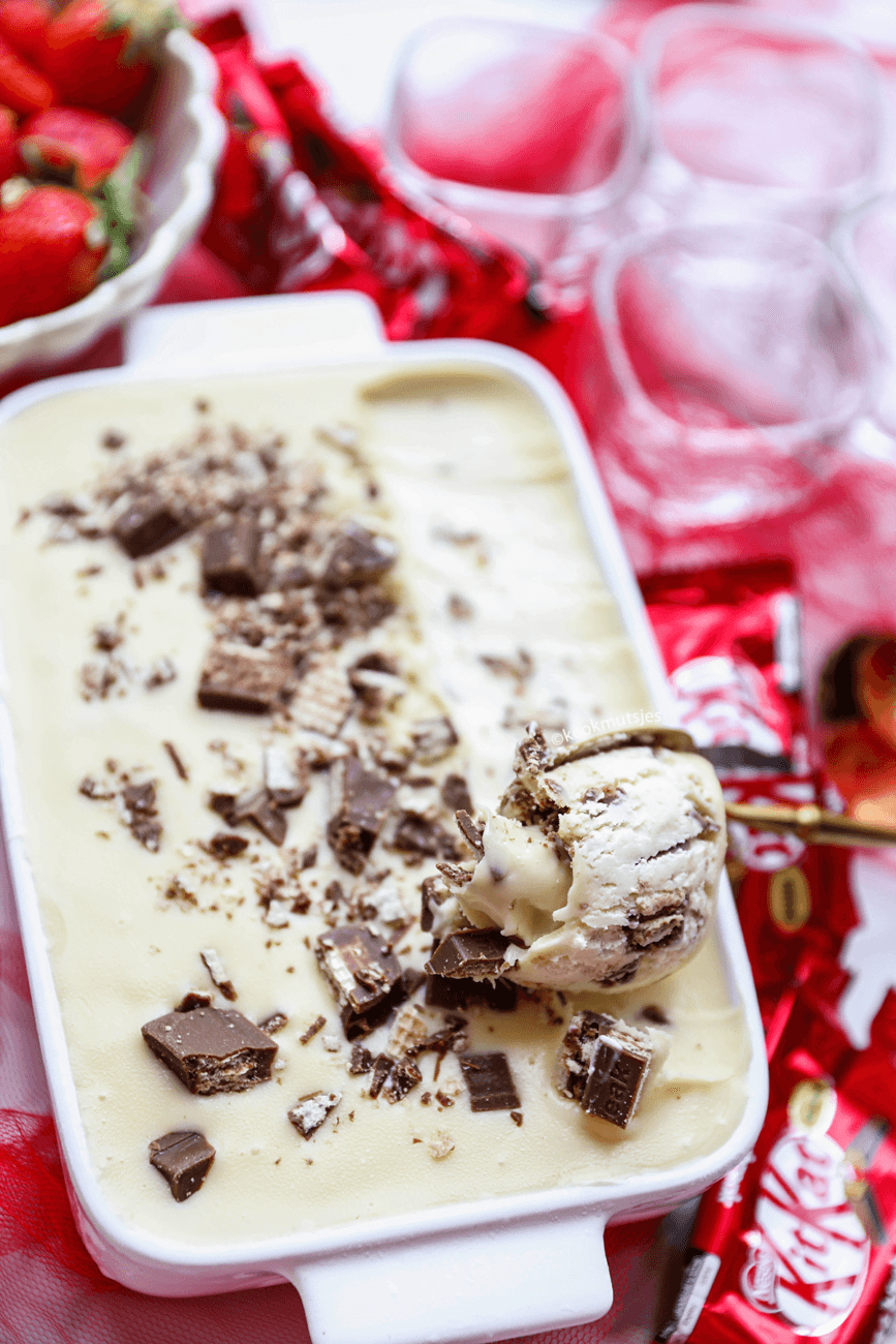 If you’re a KitKat lover, you’re going to fall head over heels for this no-churn KitKat ice cream! It’s creamy, crunchy, and packed with chocolatey goodness in every bite. The base is made with mascarpone, sweetened condensed milk, and whipped cream—so it’s rich, smooth, and super easy to make without an ice cream machine.