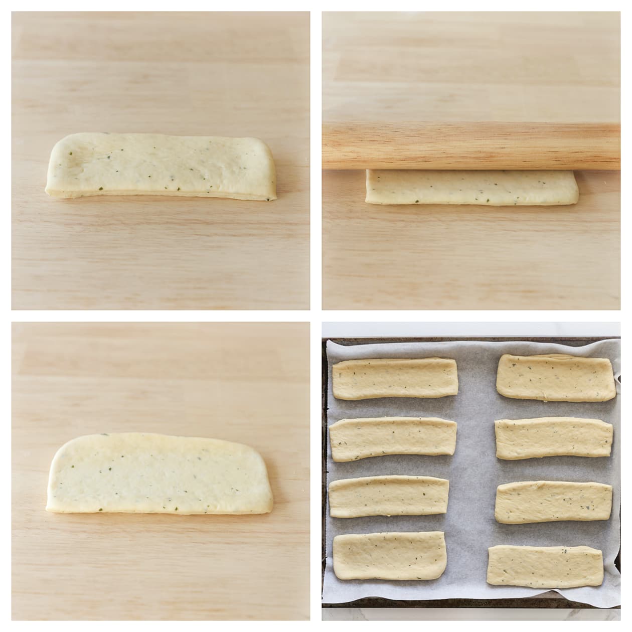 Rol elke strook lichtjes uit met een deegroller om de vorm iets te verlengen. Leg het deeg met voldoende ruimte ertussen op een bakplaat bekleed met bakpapier.
