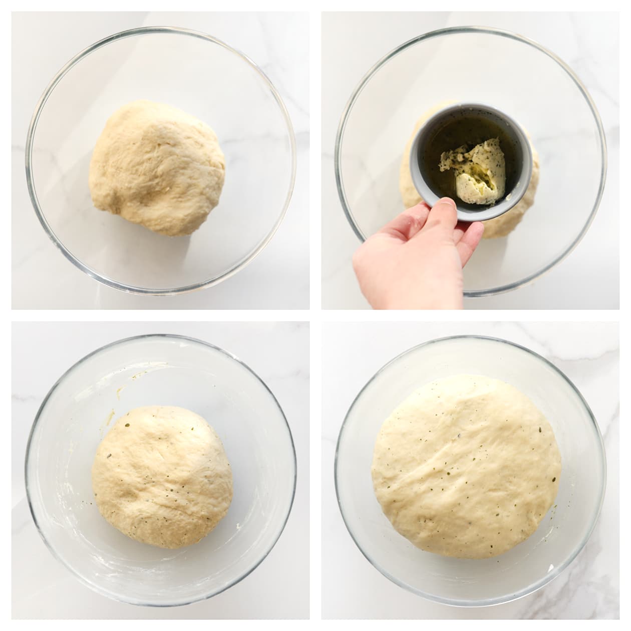 Voeg de kruidenboter toe en kneed nog 1 minuut door. Dek het deeg af en laat 1 uur rijzen, of tot het in omvang is verdubbeld.