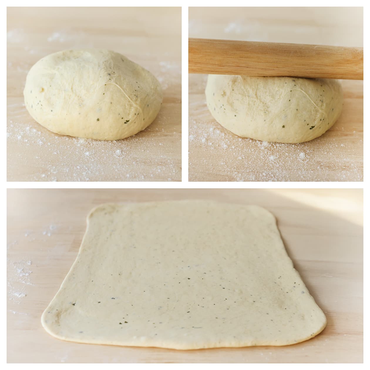 Druk de lucht uit het deeg en stort het op een met bloem bestoven werkvlak. Rol het deeg uit tot een rechthoek van 44 x 39 cm.