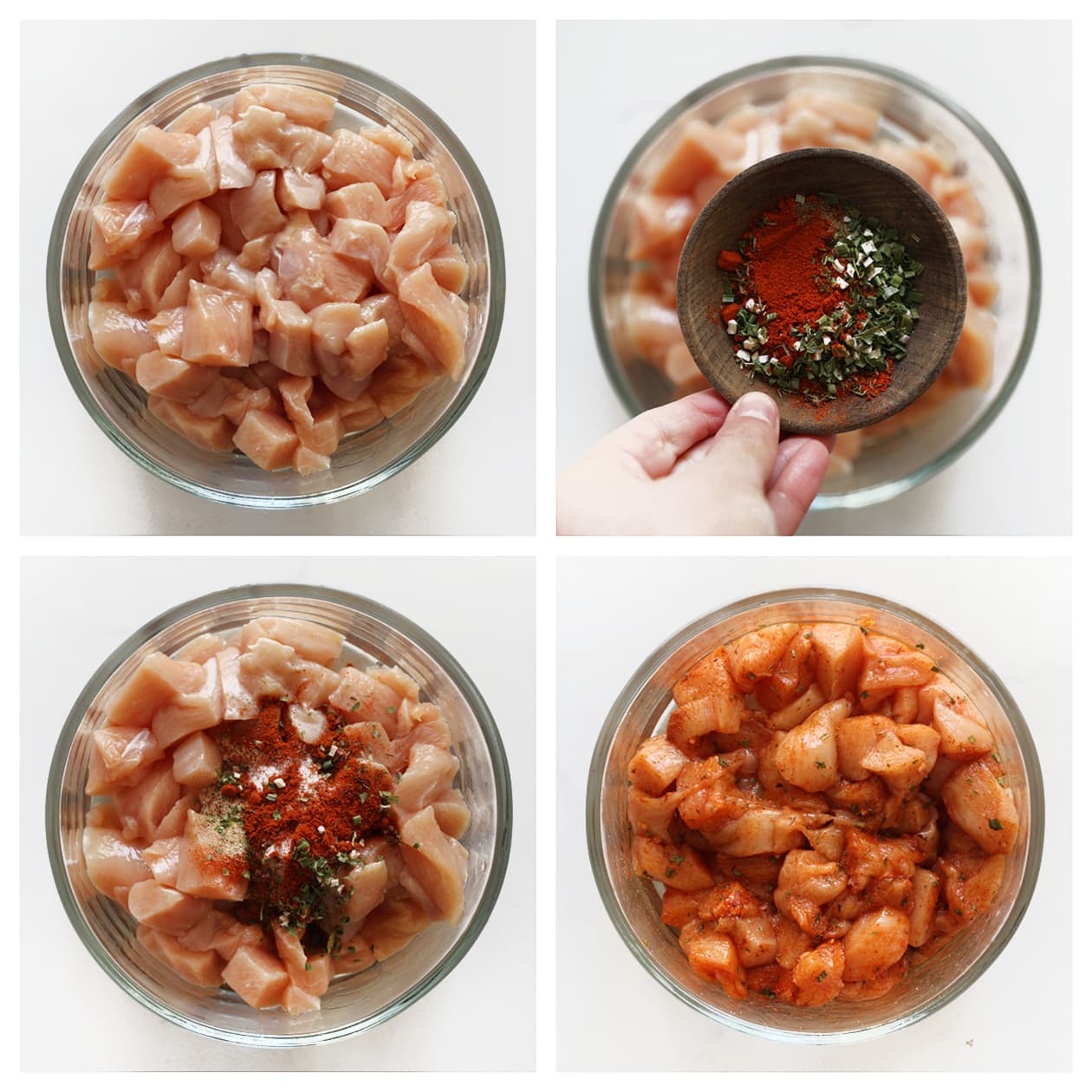 Was en snijd de kip in kleine blokjes. Doe de kip in een kom en voeg het zout, de cayennepeper, knoflookpoeder, uienpoeder, zwarte peper en olijfolie toe. Meng goed.