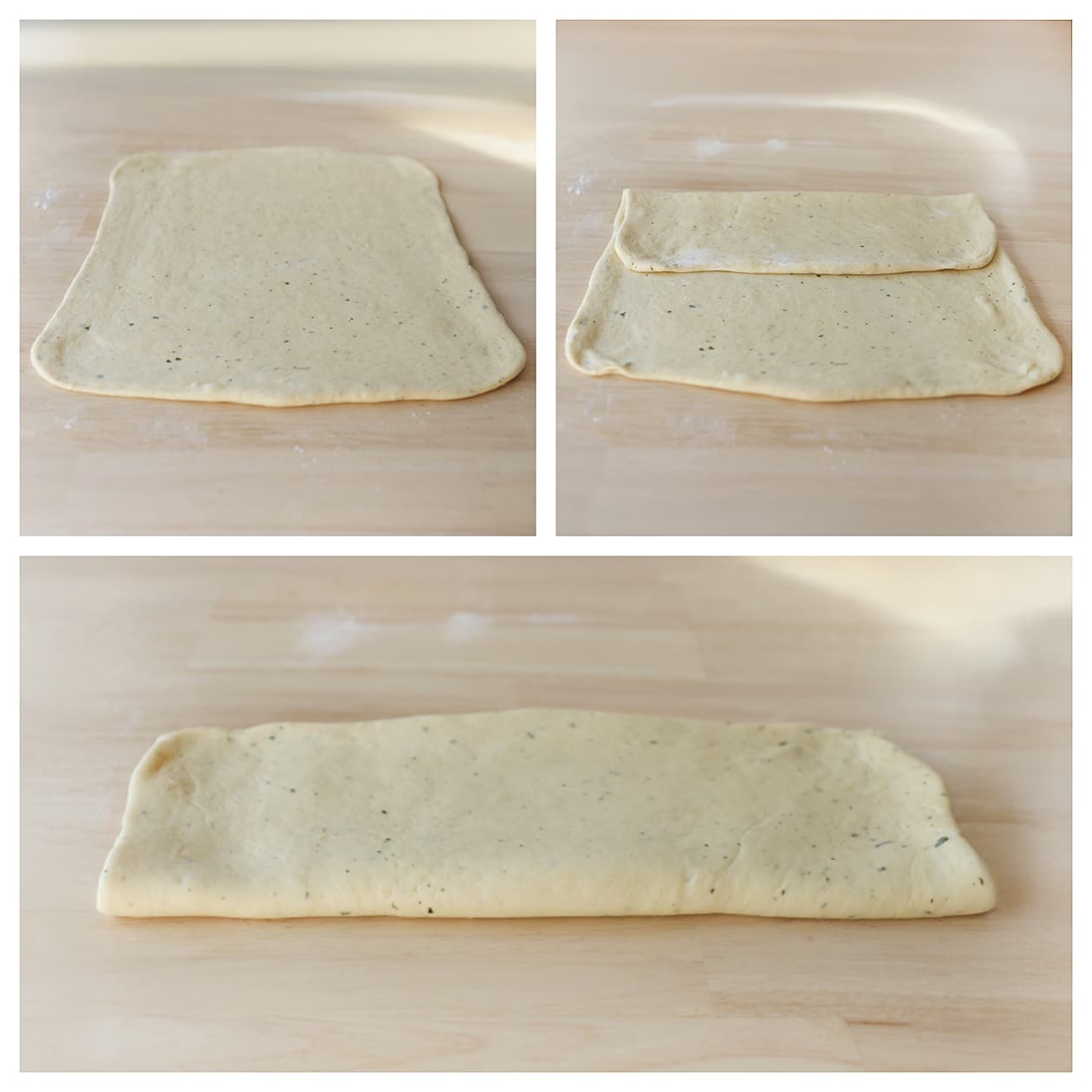 Vouw het bovenste gedeelte van het deeg naar het midden toe. Vouw vervolgens de onderkant van het deeg over het bovenste gedeelte, zodat er een drielagige rechthoek ontstaat.