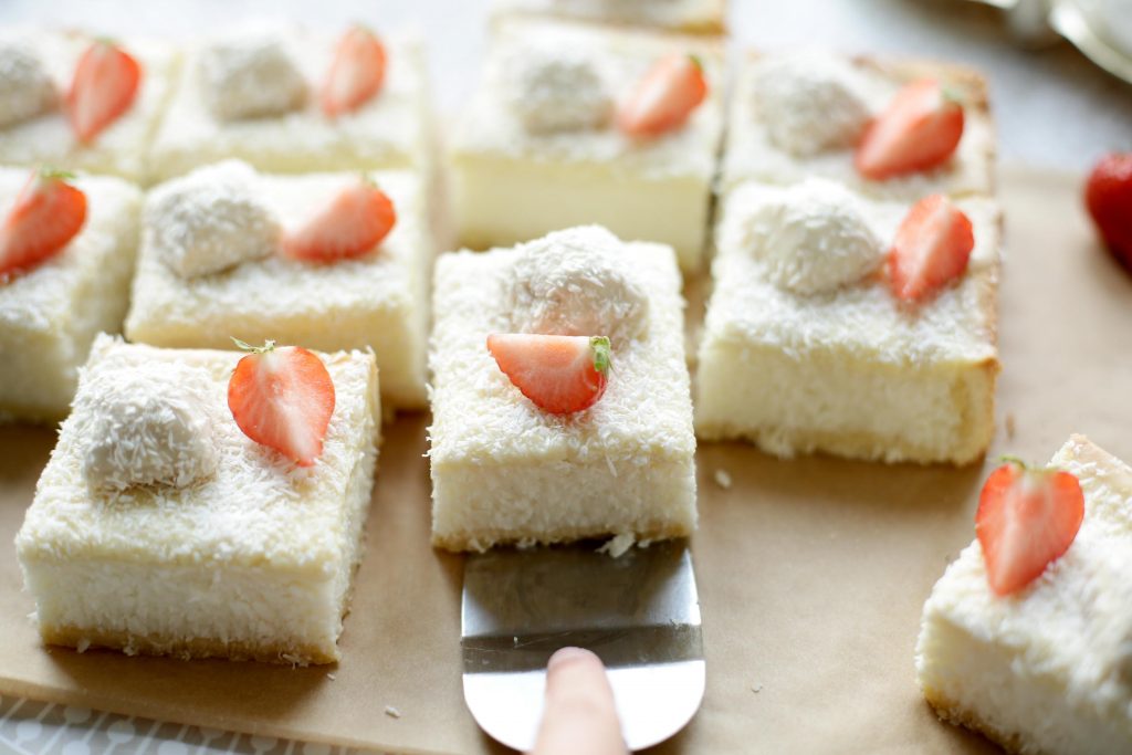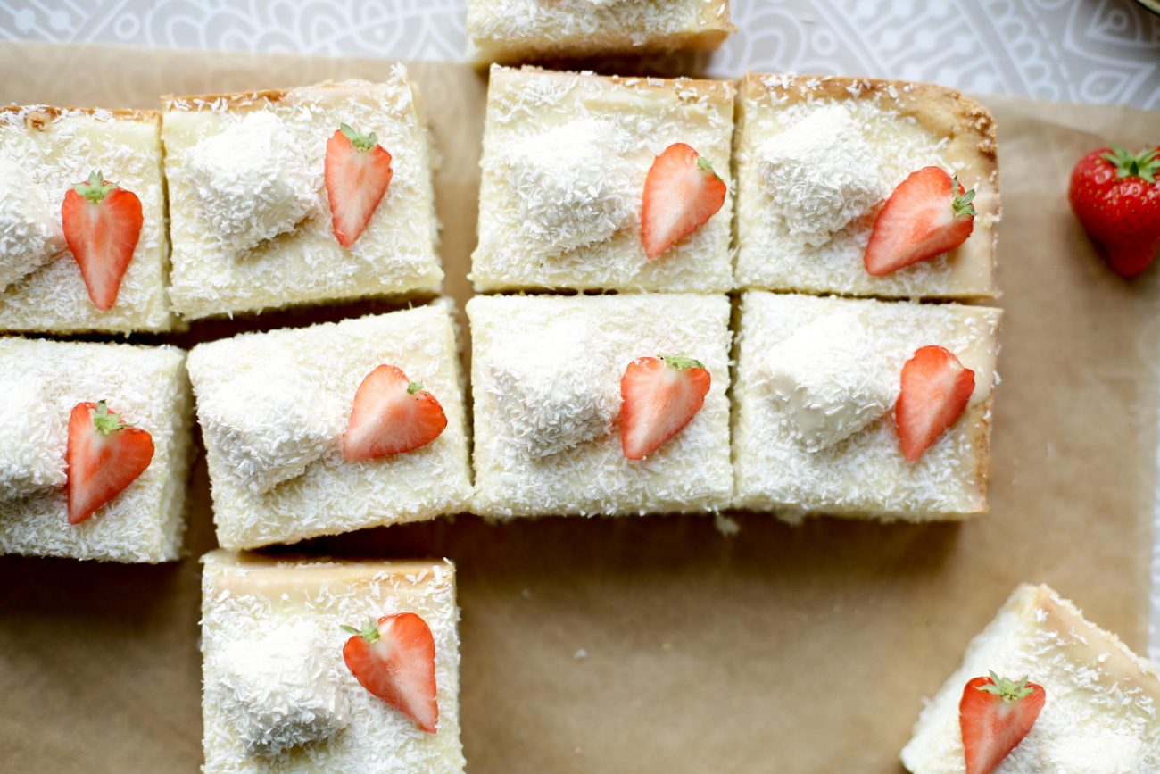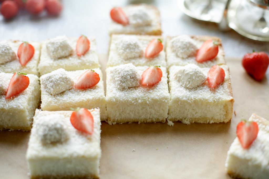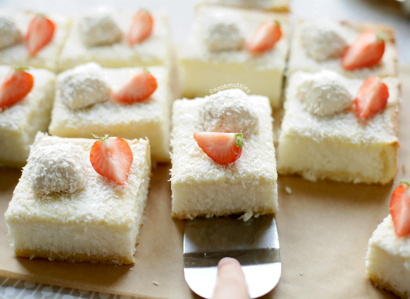 Deze kokostaart wordt gemaakt met een gekookte kokosvulling en is een grote favoriet geworden. De koekjesdeeg wordt gecombineerd met heerlijke romige vulling en chocolade ganache. Dit is zo lekker zacht, neutraal en totaal niet machtig van smaak. Een stukje hiervan is waanzinnig licht en wolkachtig, bovendien zijn ze super snoezig! Garneer de kokostaart met fruit naar keuze voor een friszoet tintje.