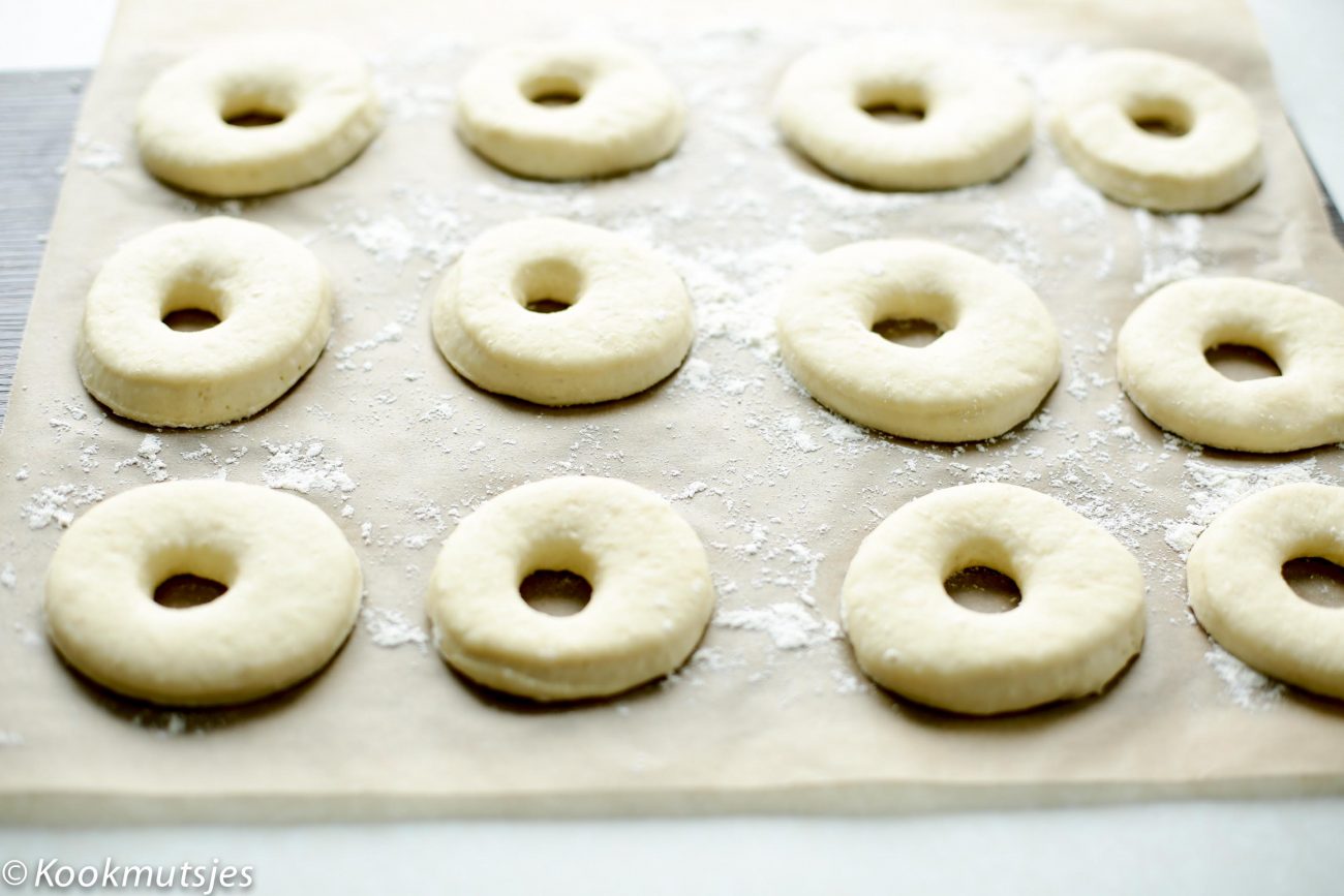 Bestuif wat bloem op de bakplaat wat bekleed is met bakpapier. Plaats het deeg hier op, verwijder de middenstuk met een kleine koekjessteker (doorsnee van 3 cm). Bedek de donuts en laat ze rijzen voor zo'n 25 tot 30 minuten.