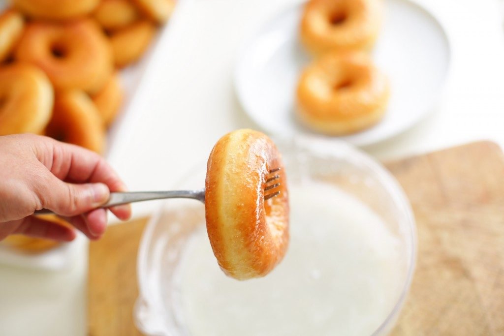 Voeg de poedersuiker, maïzena, vanillesuiker en amandelmelk in een kom, meng het goed samen. Voeg de donuts één voor één in de glazuur. Het is belangrijk dat de donuts nog wel warm zijn wanneer je ze in de glazuur dept.