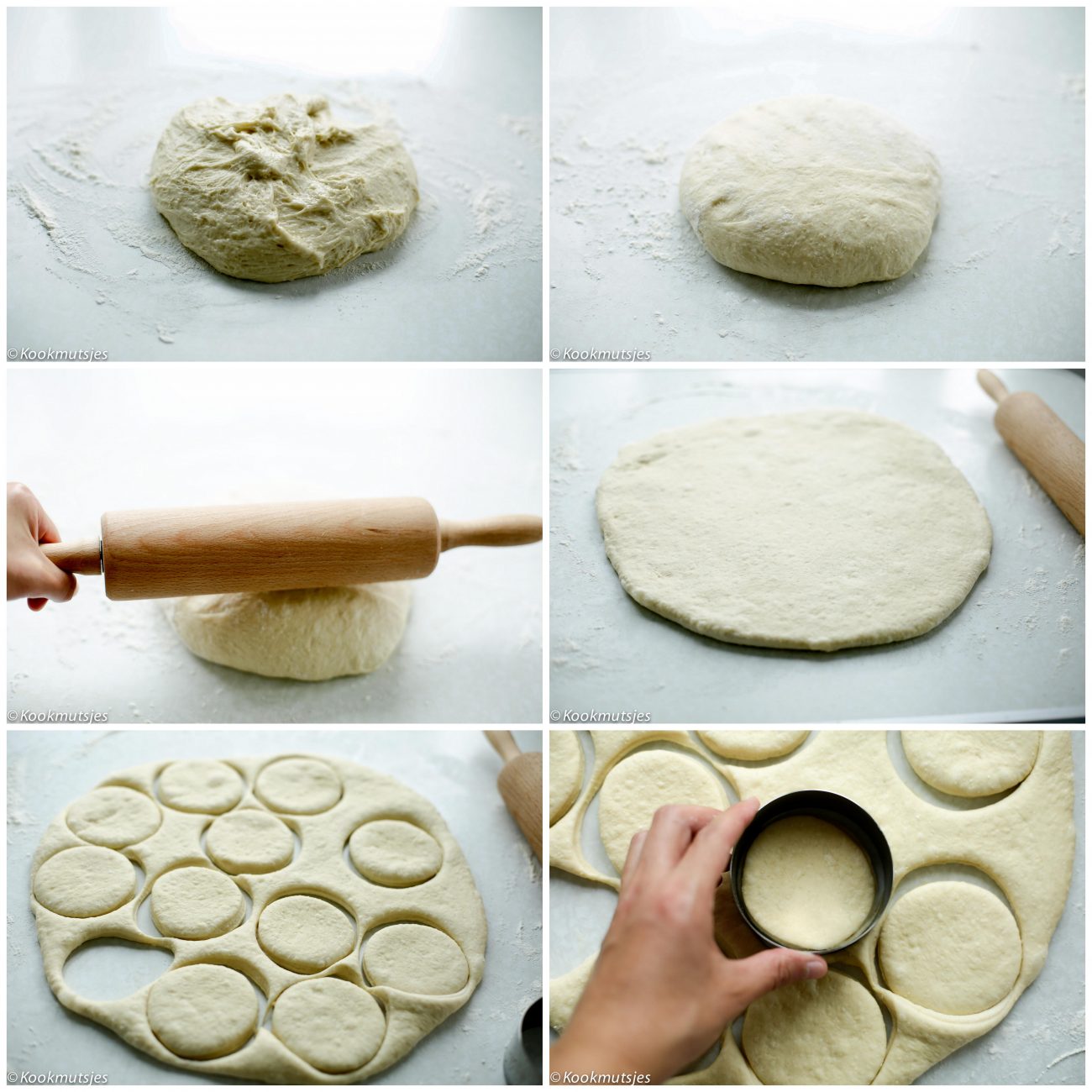 Stort het deeg op een bloem bestoven werkplek. Kneed het goed samen. Bestuif de deegroller met bloem en rol het deeg uit tot een dikte van ongeveer 1,5 cm. Snijd er met een bakring of donut uitsteker rondjes uit.
