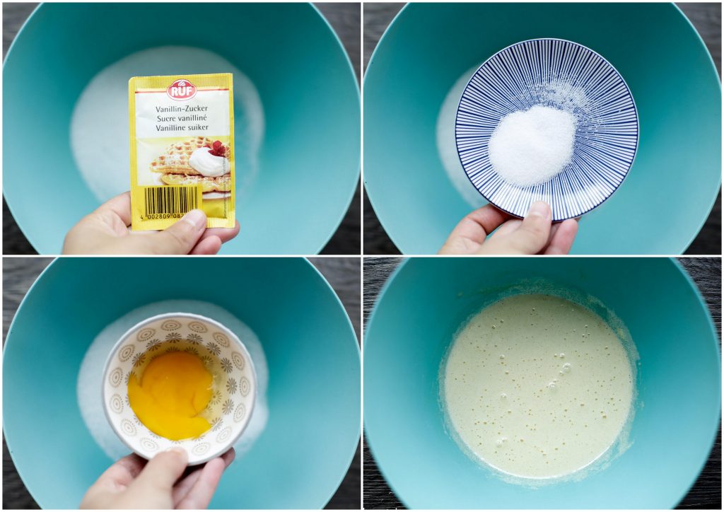 Klop de suiker, vanillesuiker, ei en zout voor zo’n 3 minuten luchtig op.