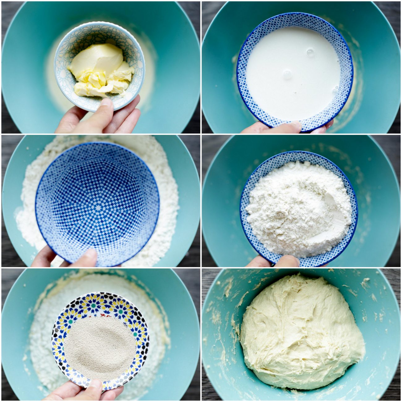Voeg de margarine toe en mix het samen tot een geheel. Voeg een beetje bij beetje de amandelmelk en water toe, mix het kort samen. Voeg de bloem en gist toe. Kneed alle ingrediënten samen voor zo’n 12 minuten tot een geheel.