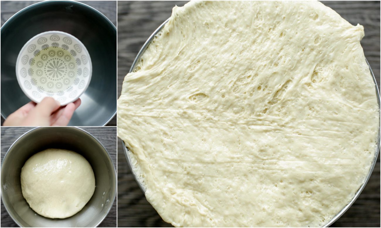 Het deeg is vrij plakkerig, daarom voeg je op het eind 10 ml zonnebloemolie toe. Dek het af en laat het deeg een uur rijzen op een warme plek of tot het in omvang is verdubbeld.