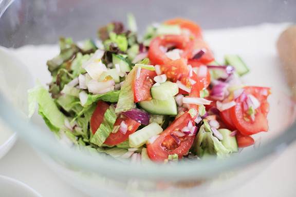 Meng de bloem, gist, zout, suiker, zonnebloemolie en yoghurt en kneed goed samen. Voeg de water beetje bij beetje toe, kneed het deeg zo’n 10 tot 15 minuten. Voeg op het eind 15 ml zonnebloemolie toe en kneed voor een minuut samen. Dek af en laat het op een warme plek rijzen voor een uur.