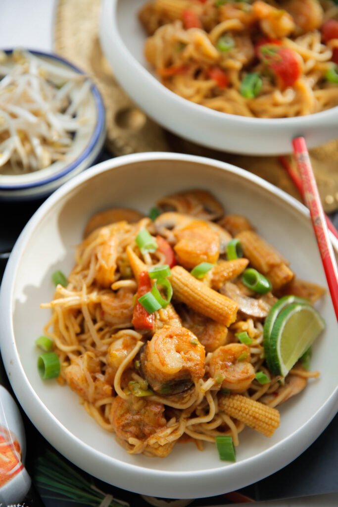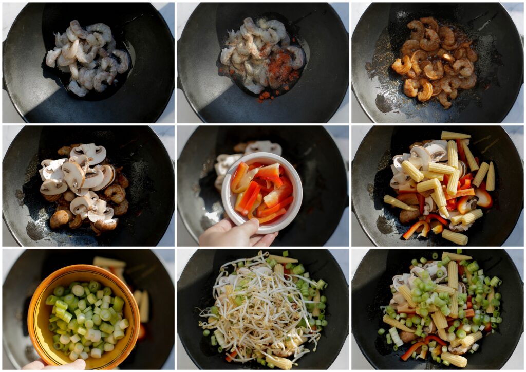 Verhit de zonnebloemolie in een wokpan op middelhoog vuur. Voeg de garnalen en het zout, toe. Hoewel het misschien afdoet aan de authenticiteit van de Laksa heb ik besloten om ook paprikapoeder, knoflookpoeder en zwarte peper toe te voegen. Dit kun je als optioneel zien en daarom ook weglaten. Bak 2 minuten. Voeg de champignons, babymaïs, rode paprika, lente ui en taugé toe. Bak 4-5 minuten. |
