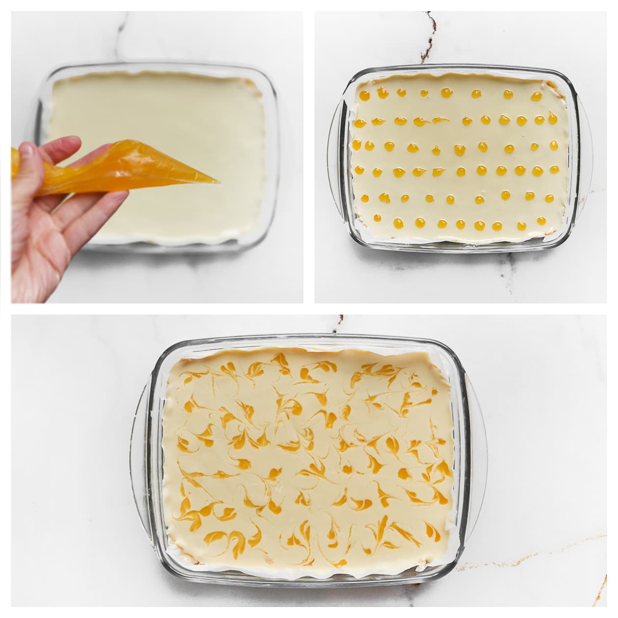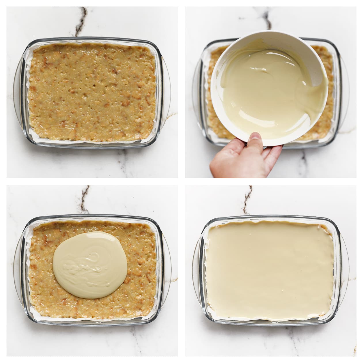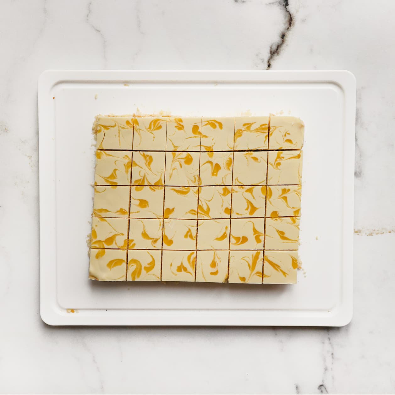Use a hot knife to cut. Dip your knife in hot water, dry it off, then slice (repeat for each cut). This gives clean edges and prevents the topping from crumbling.