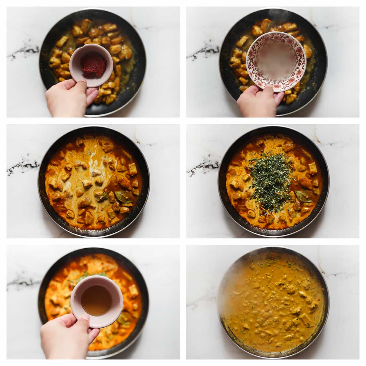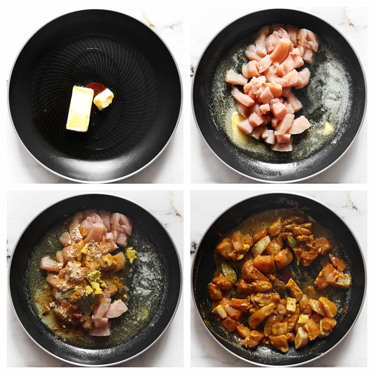 Wash the chicken thighs and cut them into pieces. Heat the olive oil and butter in a frying pan over medium heat. Add the chicken pieces along with the curry powder, turmeric, coriander powder, cinnamon, cayenne pepper, onion powder, garlic powder,cumin powder, black pepper, and bay leaves. Crumble the chicken stock cube over the pan and cook for 5-6 minutes. |
