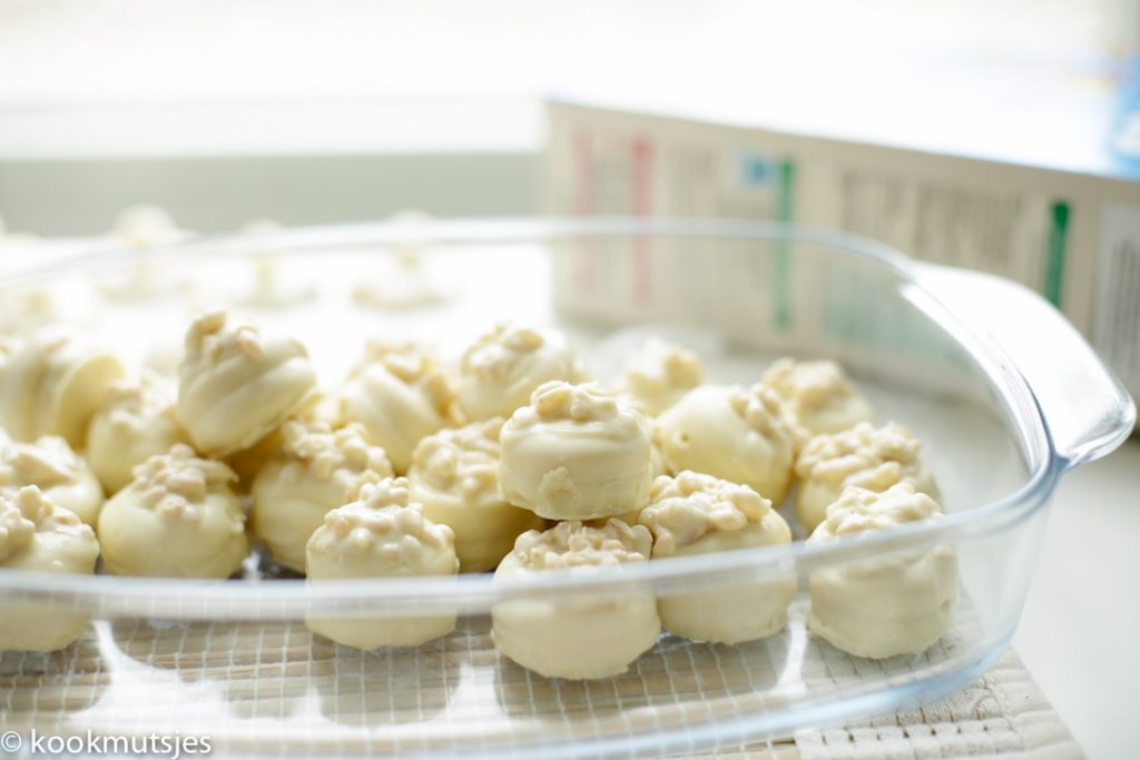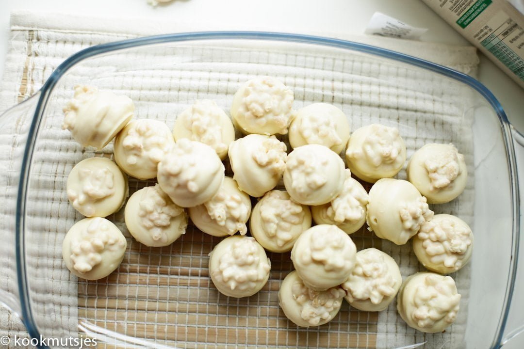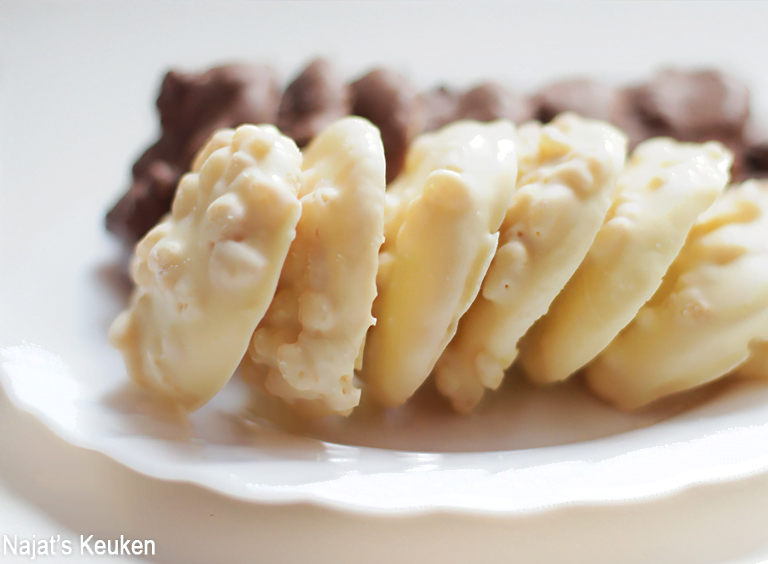 Wa’elikoem Selam Naasje, Rice Krispies is gelukkig niet zo machtig en lekker licht. Je zou het kunnen vervangen met de choco variant, maar je zou ook een paar koekjes kunnen uittesten en als je het lekker vindt de rest ook zo maken. Is het voor jou toch te machtig of niet jouw ding? Dan kun je ze plain houden en gewoon deppen in chocolade. Ook heel lekker xx!!