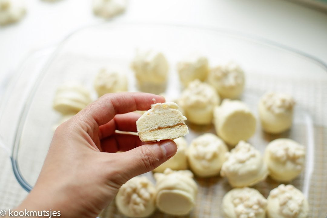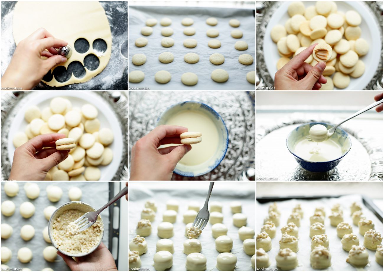 – Wanneer je het in chocolade dept, dep alleen de bovenkant van het koekje. onderkant hoef je niet te deppen.