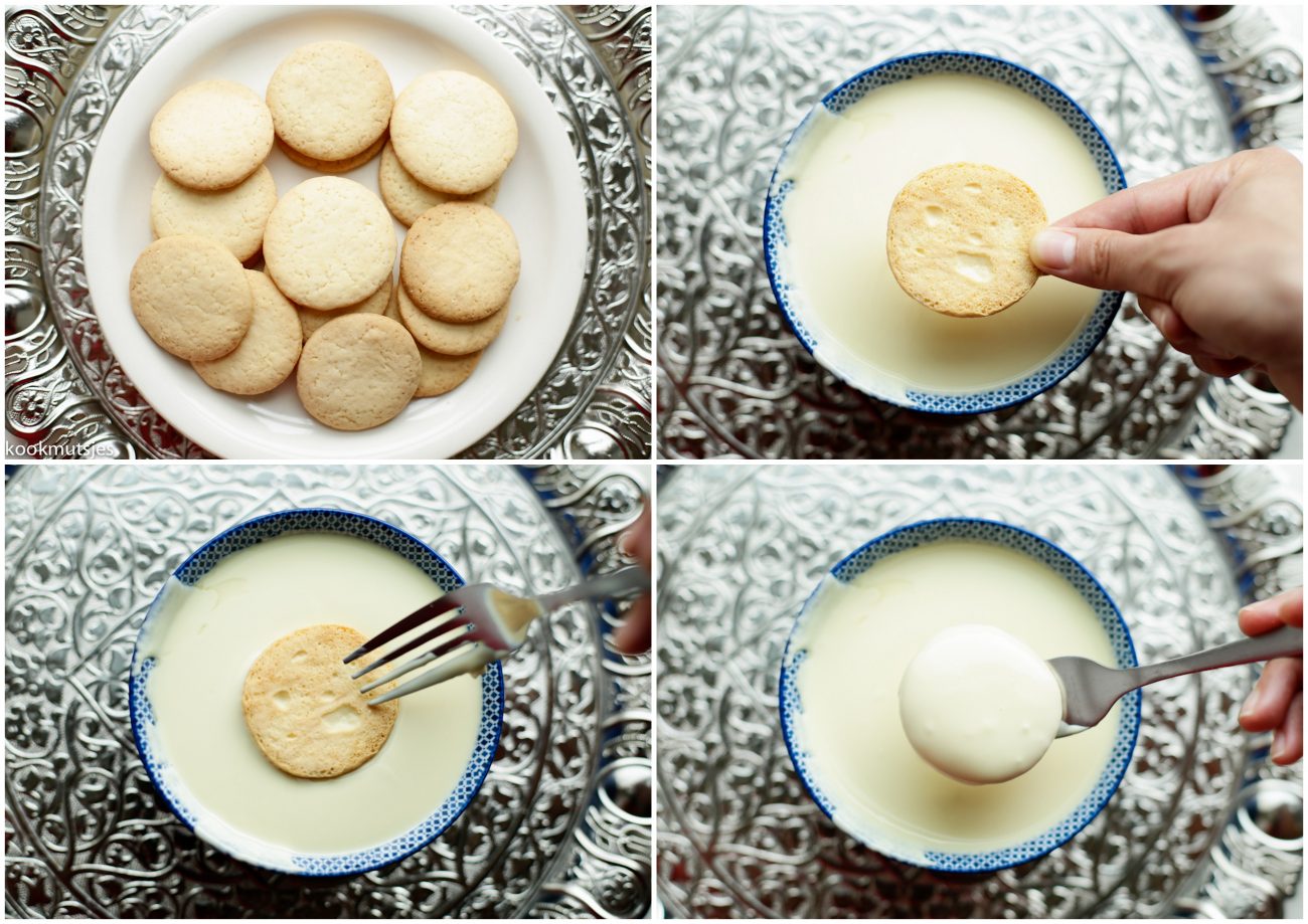 Hebt u bij de stappenplan 5 wanneer je de koekjes indompel helemaal ingedompeld of enkel de bovenstuk. Ik zie t niet zo goed