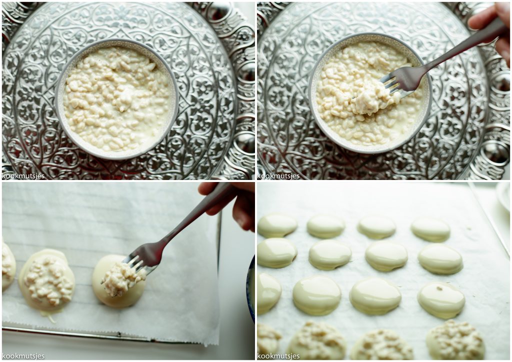 wa’elikoem selam, ik laat het zelf wel even lichtjes afkoelen voordat ik de krispy rice toevoeg. Laat het niet te lang afkoelen, want dan krijg je moeite de chocolade mooi op de koekjes te krijgen.