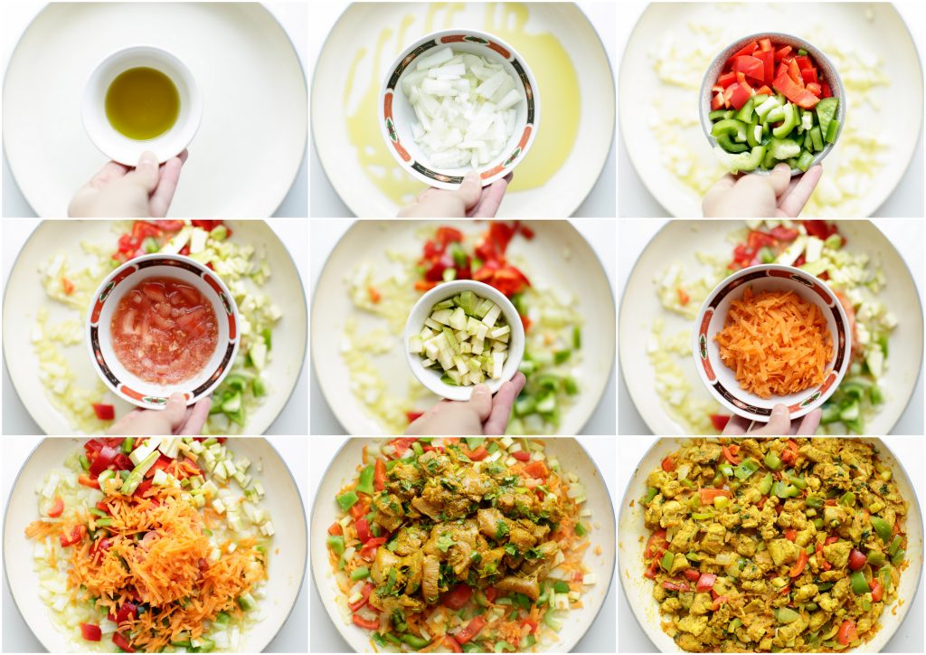 Rasp de knoflook. Hak de koriander fijn. Snijd de ui, paprika’s en courgette klein. Rasp de wortel en tomaat. |