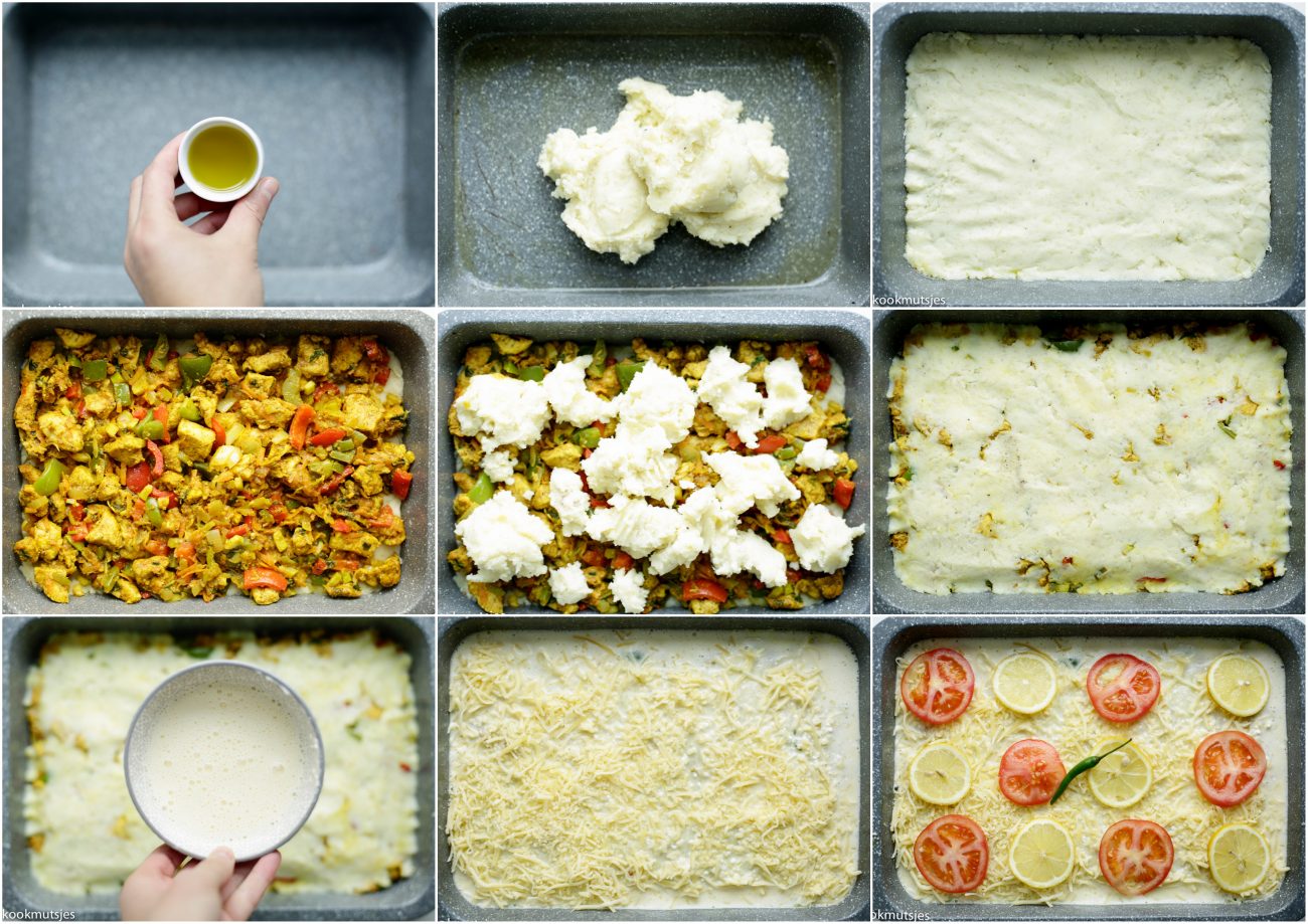 Vet de ovenschaal in met wat olijfolie. Verdeel de helft van de gepureerde aardappels gelijkmatig over de schaal. Verdeel de kip-mengsel over de aardappels en maak het weer af met de resterende gepureerde aardappels. Voeg de la vache quirit mengsel over de schotel heen en maak het af met geraspte kaas, schijfjes tomaat en citroen (eventueel een hete pepertje). |