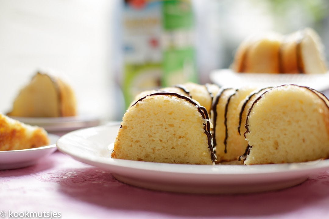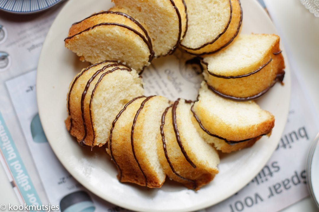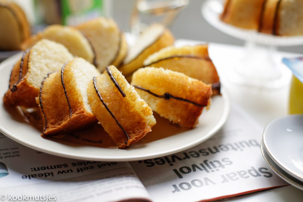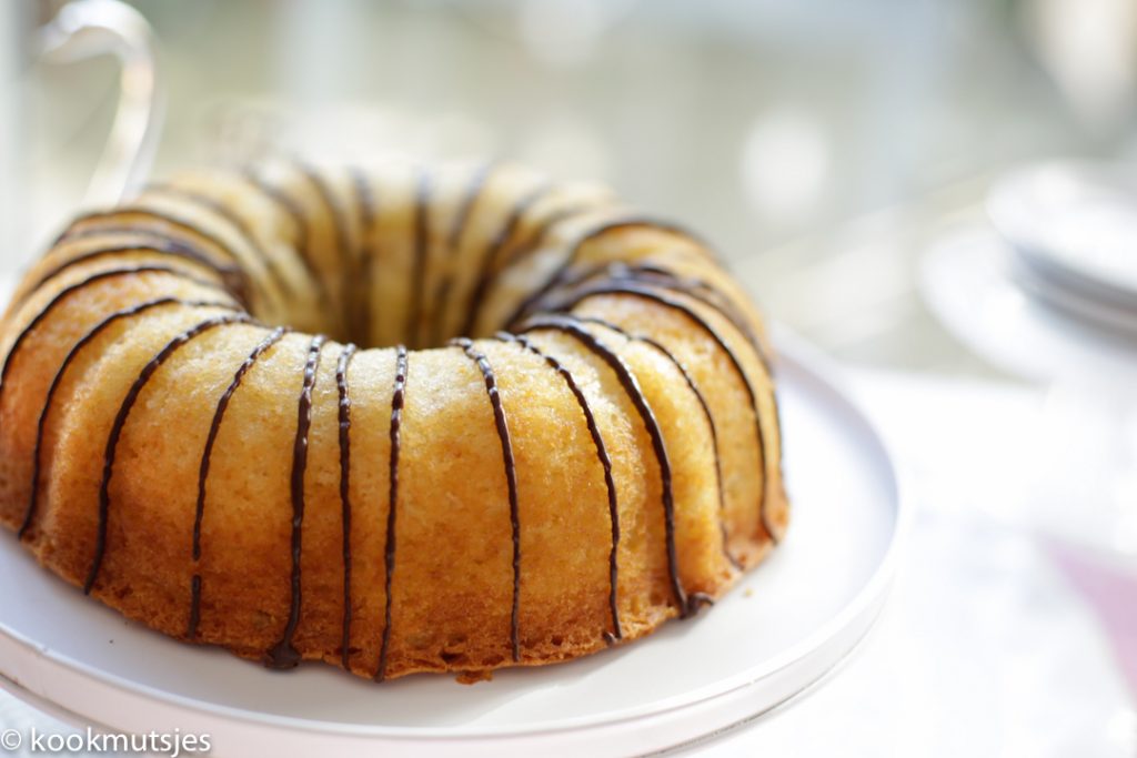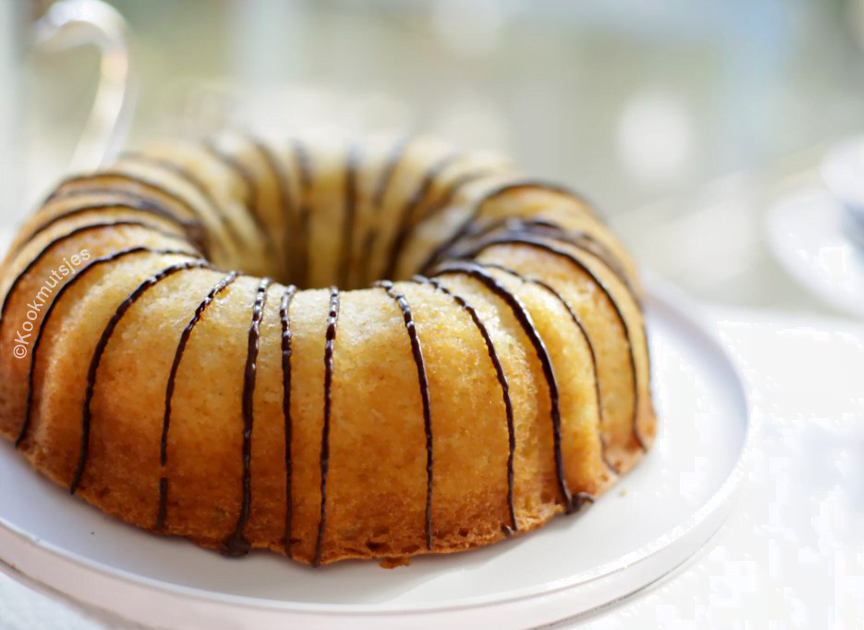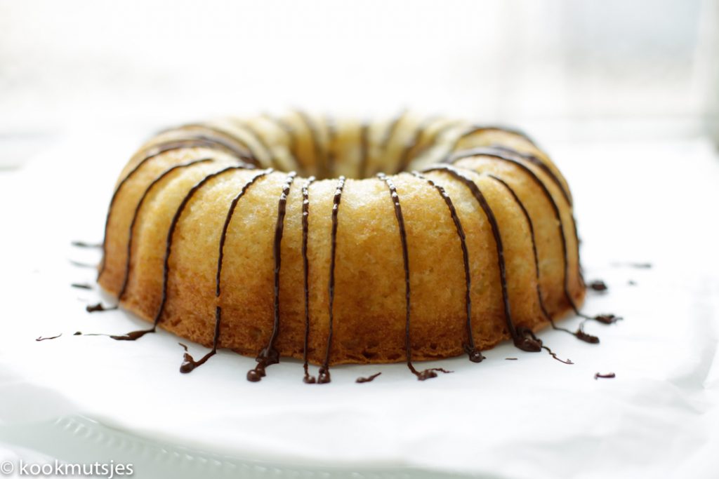 De cake heeft het niet echt nodig maar omdat chocolade en banaan goed samen gaan heb ik de cake gegarneerd met streepjes van gesmolten chocolade. De bananencake is echt delightful, serveer het bij de koffie of thee en je zit meteen goed.