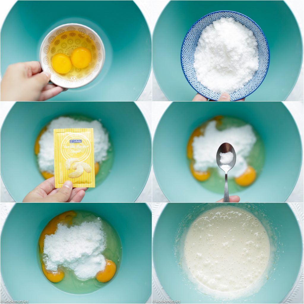 Klop de eieren op samen met de witte basterdsuiker, vanillesuiker en zout voor zo’n 4 minuten op hoge snelheid. Het moet een schuimig effect krijgen met een lichtgele kleur.