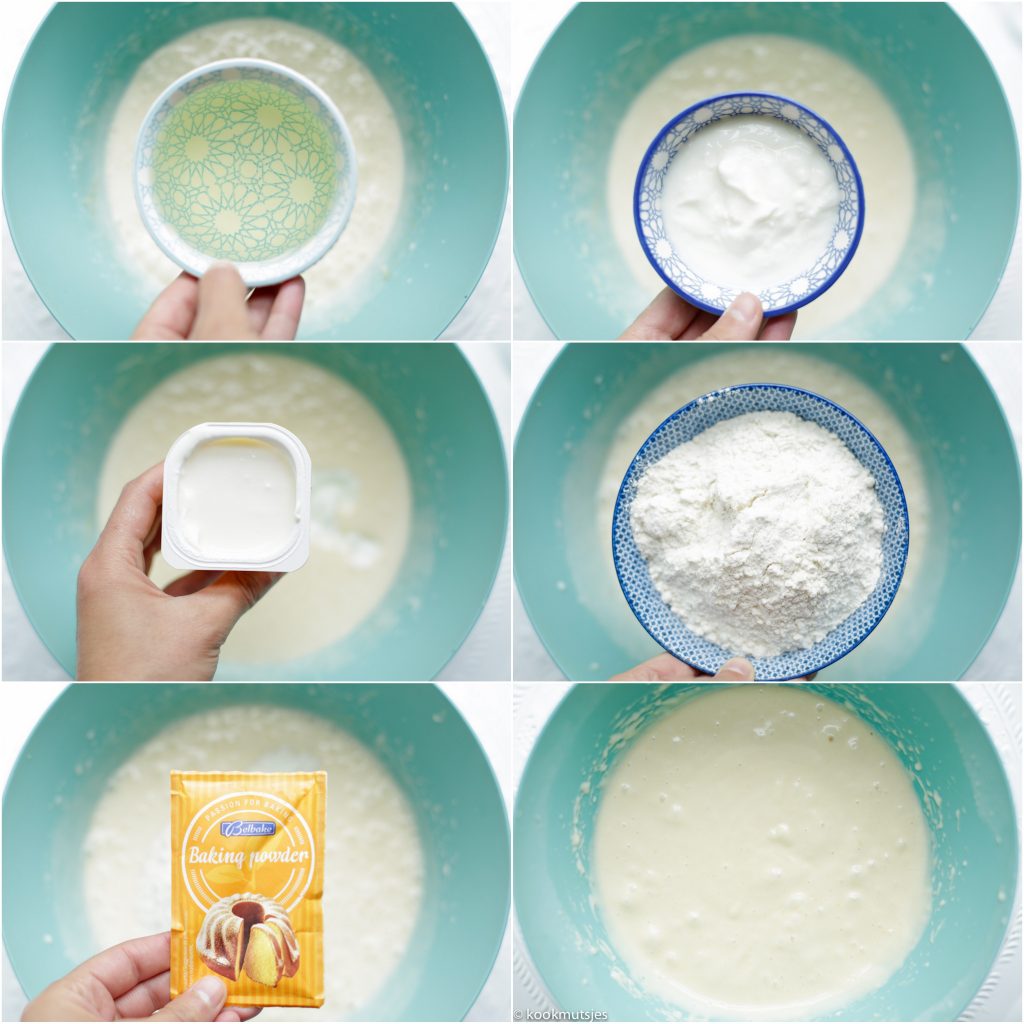 Voeg de zonnebloemolie, yoghurt en danone toe, mix tot een geheel. Als laatst voeg je de bloem en bakpoeder toe. Mix samen tot een gladde beslag.