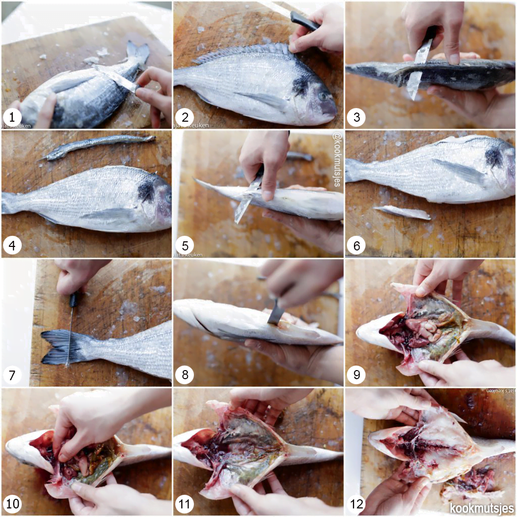 1 - Ontschub de dorade met een mes. Je kunt de visboer vragen om de dorade vooraf te schubben en de ingewanden te verwijderen, dan hoef je dit niet zelf te doen. |