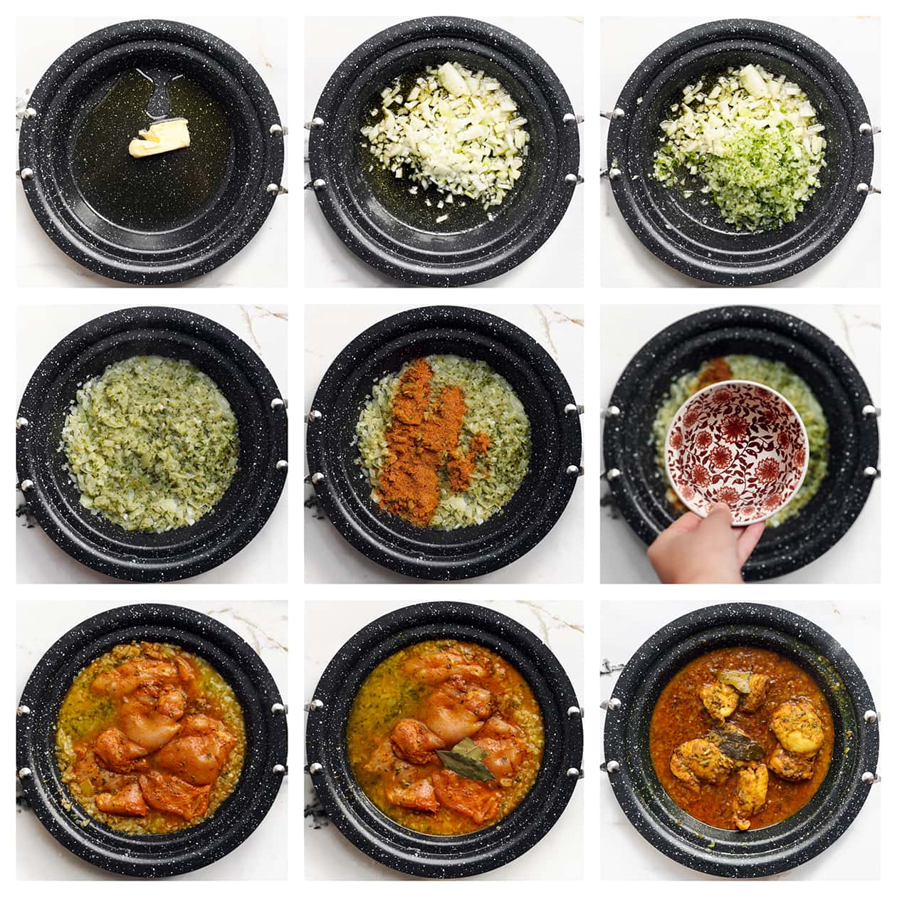 Verhit de olijfolie en roomboter in een pan op middelhoog vuur. Voeg de gesnipperde gele ui en het groentemengsel toe. Bak dit 2-3 minuten. Voeg het overige kruidenmengsel, water, de gemarineerde kip en de laurierblaadjes toe aan de pan. Zet het vuur hoog en breng aan de kook. Zodra het mengsel begint te pruttelen, zet je het vuur laag. Dek de pan af en laat het geheel 25-30 minuten zachtjes koken.