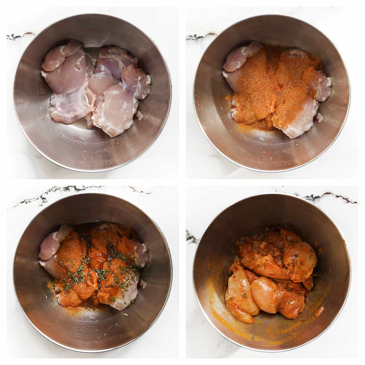 Doe de kippendijen in een kom en voeg de helft van het kruidenmengsel, de gedroogde peterselie en de olijfolie toe. Meng goed en laat marineren terwijl je de andere stappen voorbereidt.