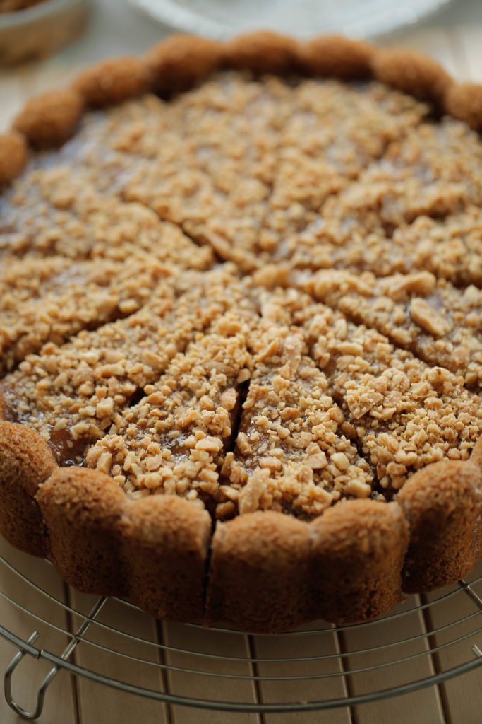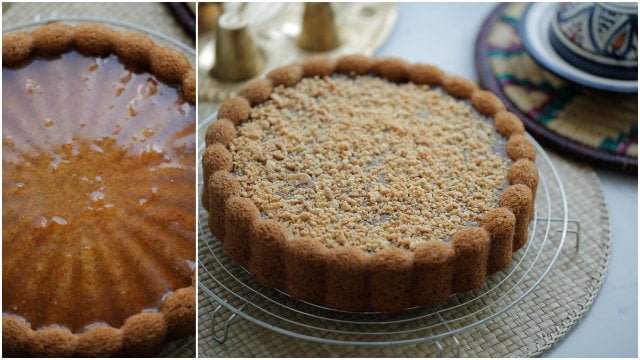Giet het abrikozen-mengsel over de cake en laat het even intrekken. Garneer de cake met gemalen noten.