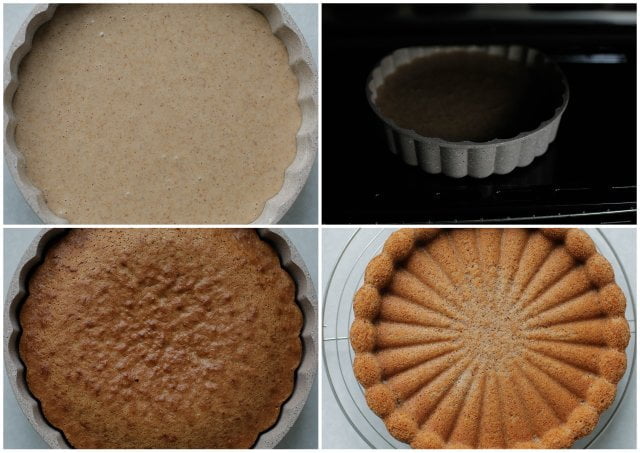 Vet de bakvorm goed in en giet het beslag erin. Leg de cake in de voorverwarmde oven op 160℃ voor zo’n 30 tot 35 minuten. De cake is gaar als je er met een satéprikker in prikt en er droog uitkomt.