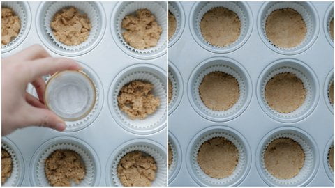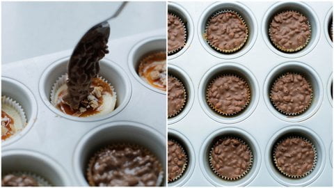 Vul de cupcake papiertjes in met het cheesecake beslag (45 gram per cheesecake). Spuit 5 gram karamel in de cheesecake. Leg de mini Lion cheesecakes in de voorverwarmde oven op 115℃ voor zo’n 22 tot 28 minuten. Doe de oven uit en laat de cheesecakes langzaam op temperatuur komen in de oven. Doe dit met de ovendeur dicht, zo voorkom je dat de cheesecakes barsten (ik laat ze meestal voor een uur in de oven en dan leg ik de cheesecakes afgedekt in de koelkast). |