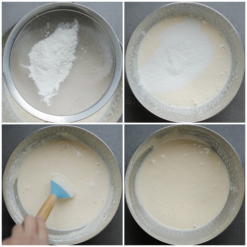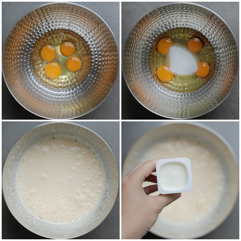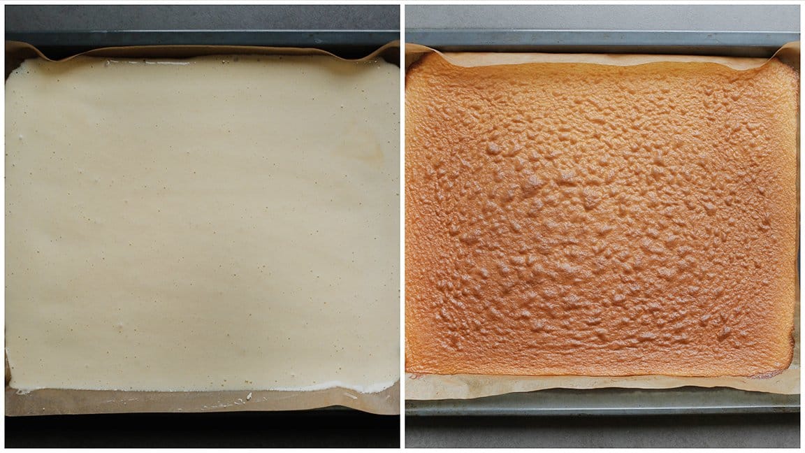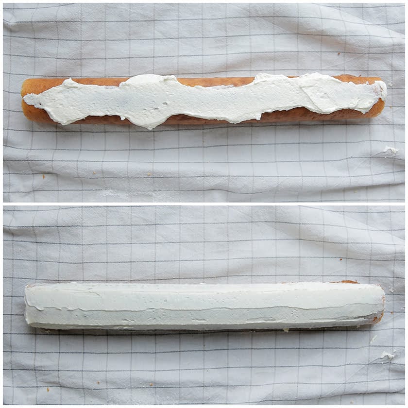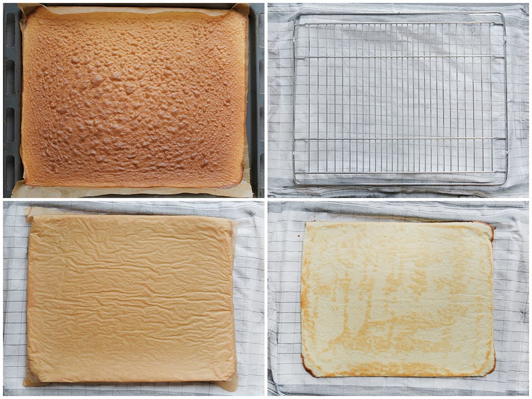 Snijd de cake verticaal door het midden. Rol de twee stukken cakes naar binnen met behulp van een vochtige theedoek of bakpapier. Doe dit direct wanneer de cake warm is! Zo gaat het rollen makkelijker en scheurt het niet of vrij weinig. Leg de cakes weg in de koelkast (30 minuten, maar mag ook langer). |