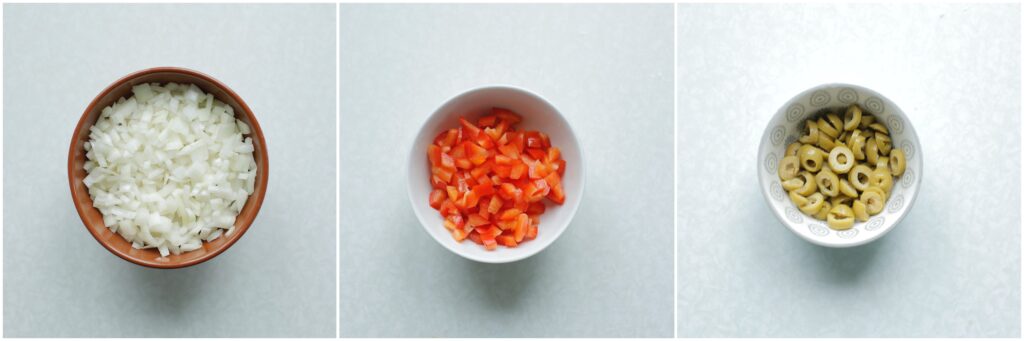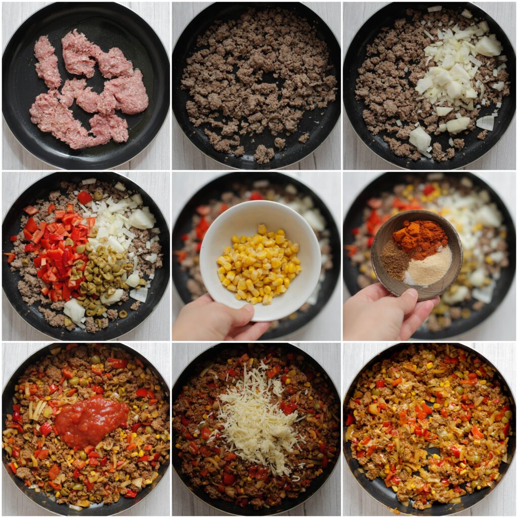 Verhit de olijfolie in een pan op middelhoog vuur. Voeg het gehakt toe en bak in ca. 6-8 minuten gaar. Voeg het zout, de komijn, paprikapoeder, kaneel, zwarte peper, knoflookpoeder en uienpoeder toe. Meng goed. Voeg de gele ui, puntpaprika, groene olijven en maïs toe. Bak 2-3 minuten. Voeg de tomatensalsa en geraspte mozzarella toe. Kook mee voor een minuut. |